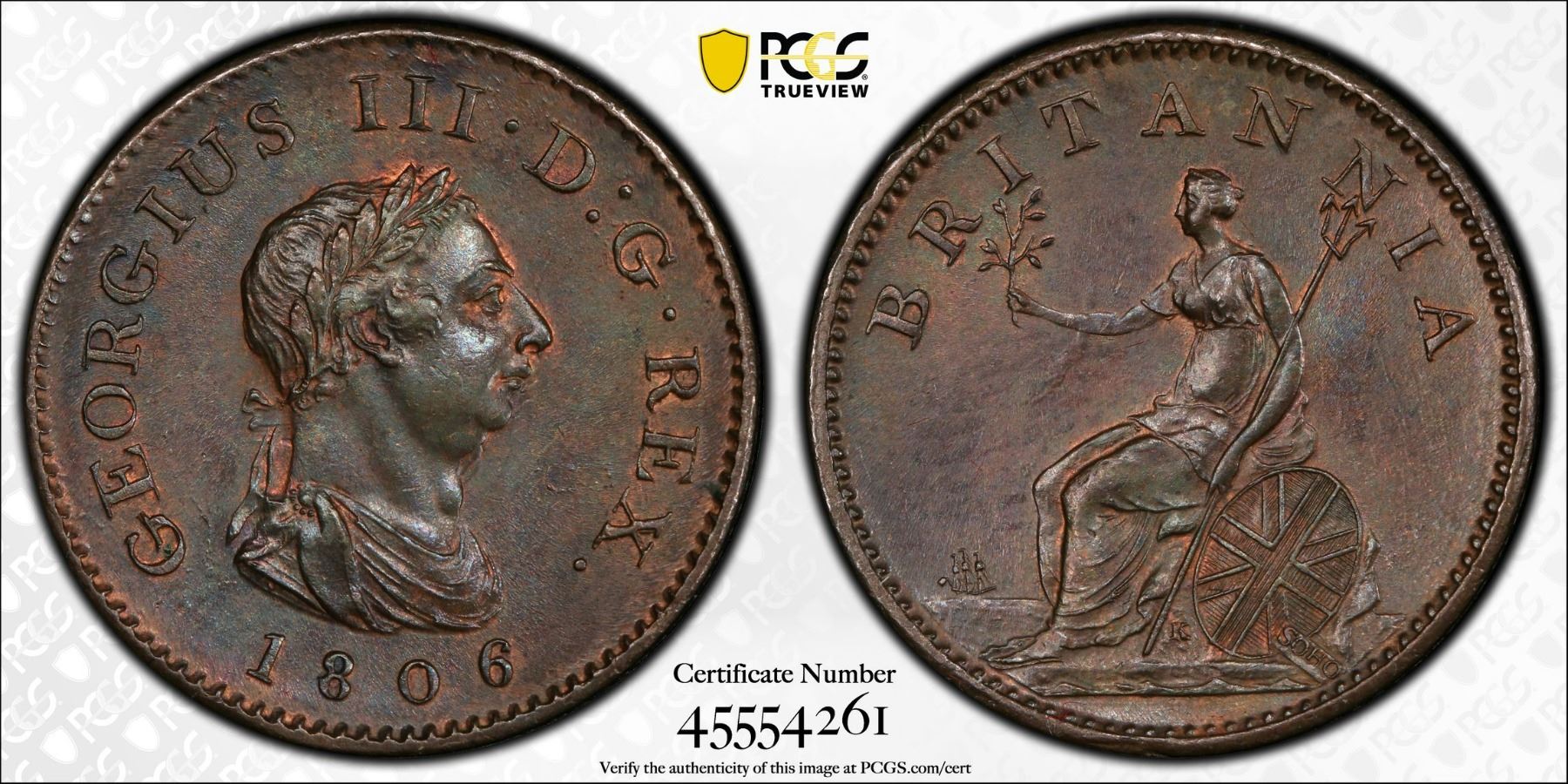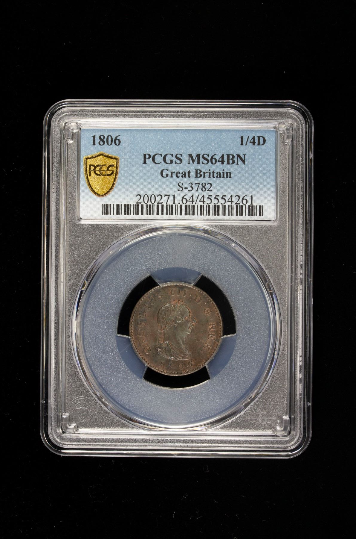 GREAT BRITAIN: George III, 1760-1820, AE farthing, 1806, PCGS MS64 BN