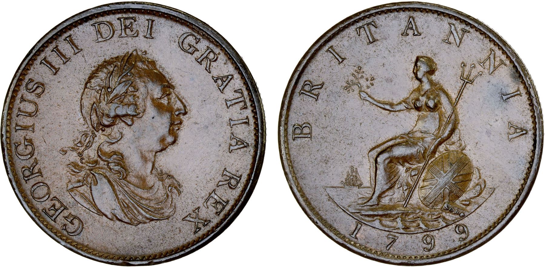 GREAT BRITAIN: George III, 1760-1820, AE halfpenny, 1799, KM-647, Spink-3778, variety with raised line along hull (rare) and 1 not touching sea, brown and glossy, AU.