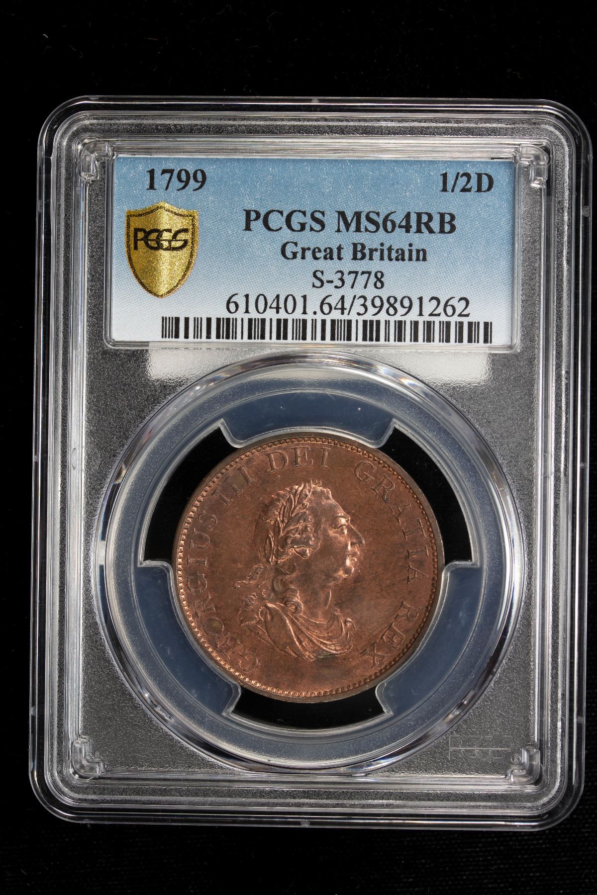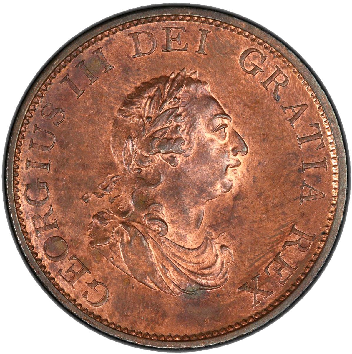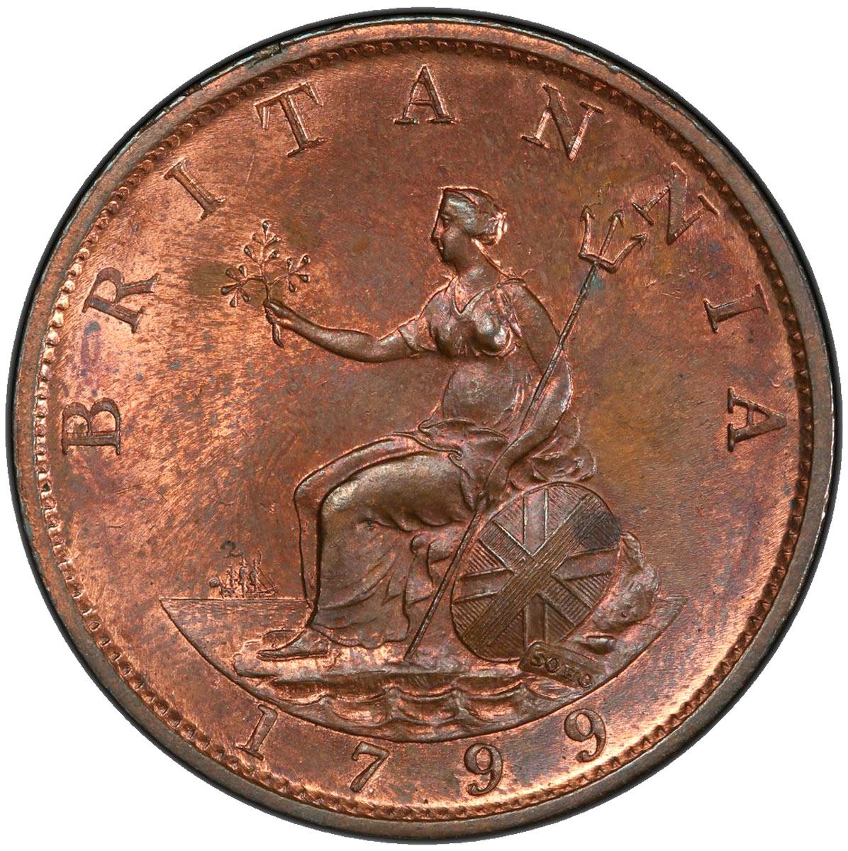 GREAT BRITAIN: George III, 1760-1820, AE halfpenny, 1799, KM-647, S-3778, much original red mint luster! PCGS graded MS64 RB.