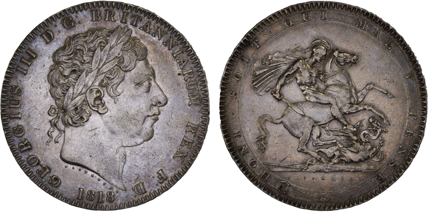 GREAT BRITAIN: George III, 1760-1820, AR crown, 1818, KM-675, Cr-34, S-3787, LVIII on edge, lightly cleaned, lightly toned, XF.