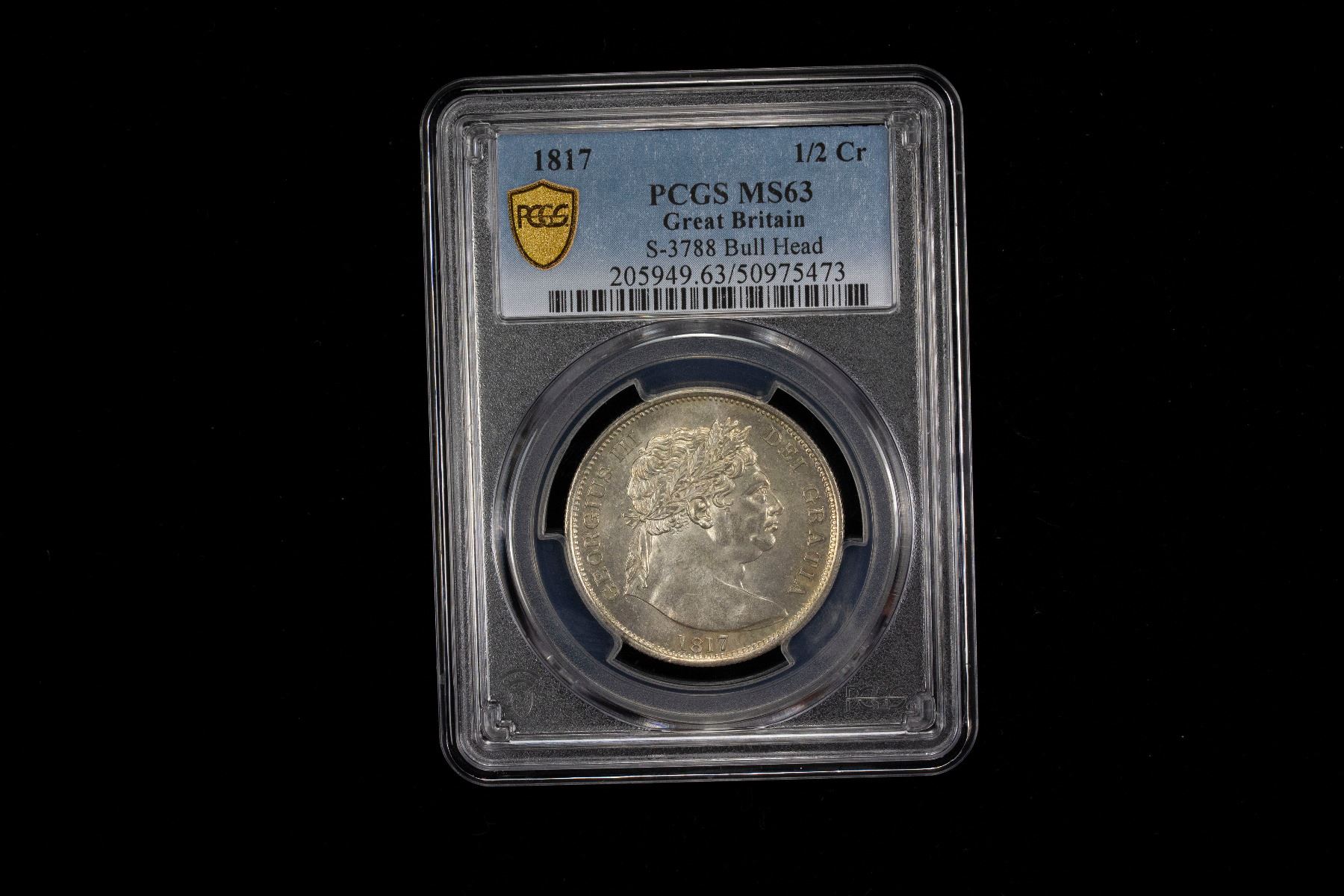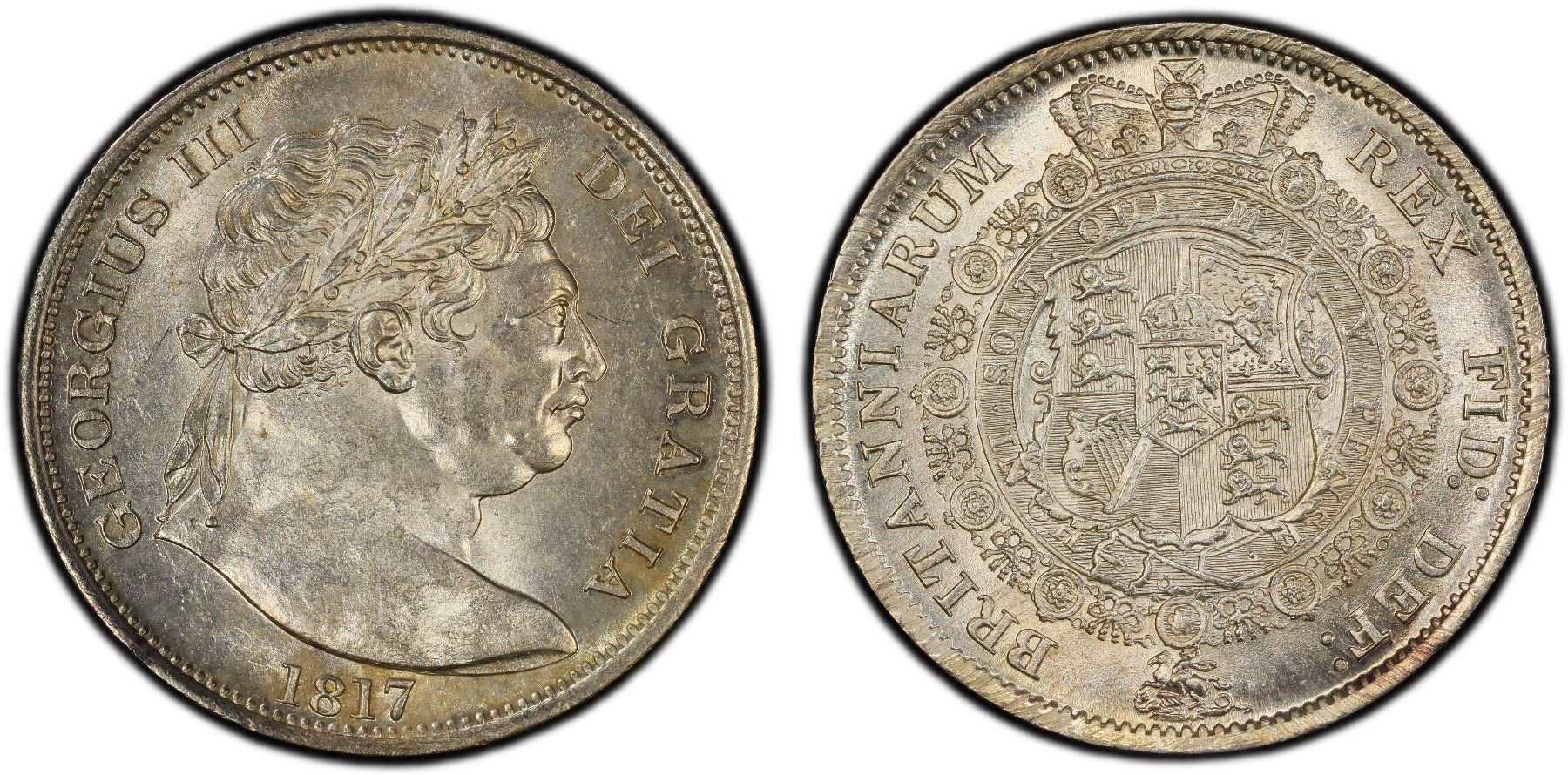 GREAT BRITAIN: George III, 1760-1820, AR halfcrown, 1817, KM-667, S-3788, 'bull' head type, a lovely mint state example! PCGS graded MS63.