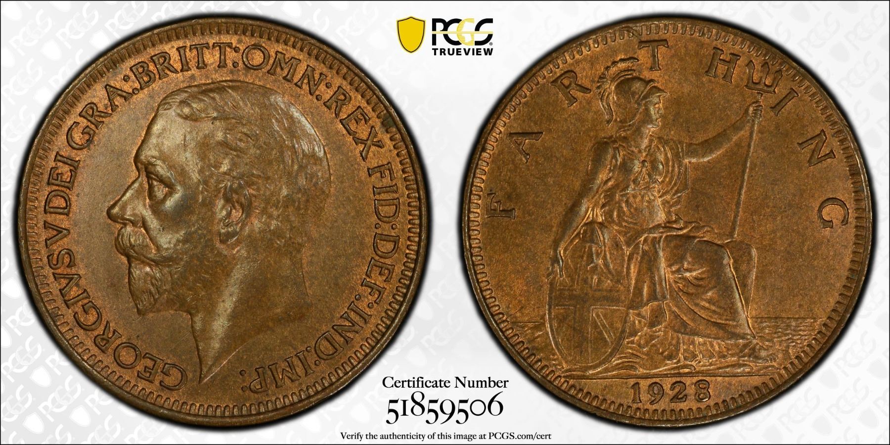 GREAT BRITAIN: George V, 1910-1936, AE farthing, 1928, PCGS MS64 BN