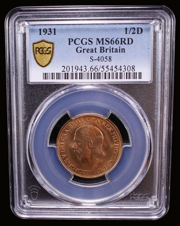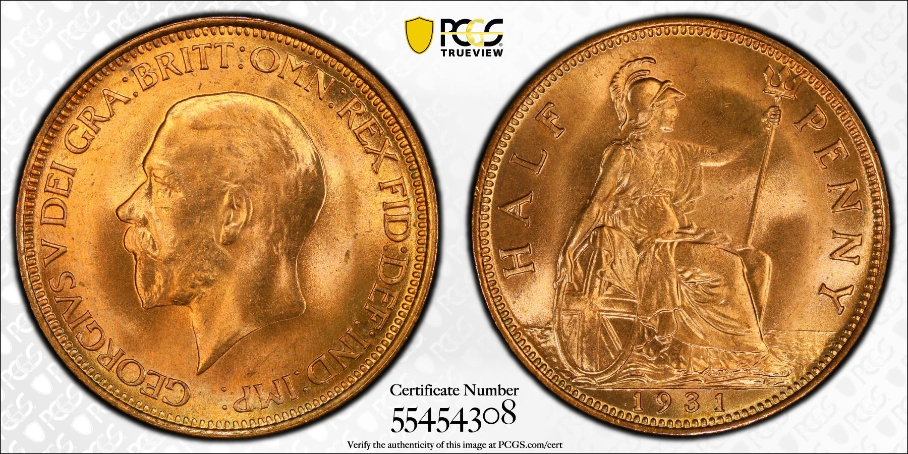 GREAT BRITAIN: George V, 1910-1936, AE halfpenny, 1931, PCGS MS66 RD
