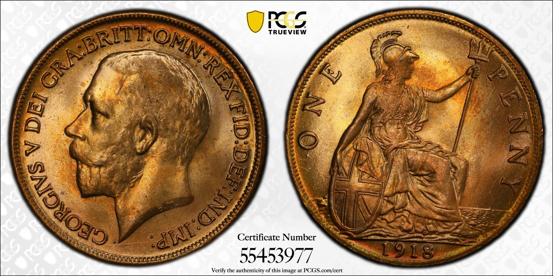 GREAT BRITAIN: George V, 1910-1936, AE penny, 1918, PCGS MS64 RD