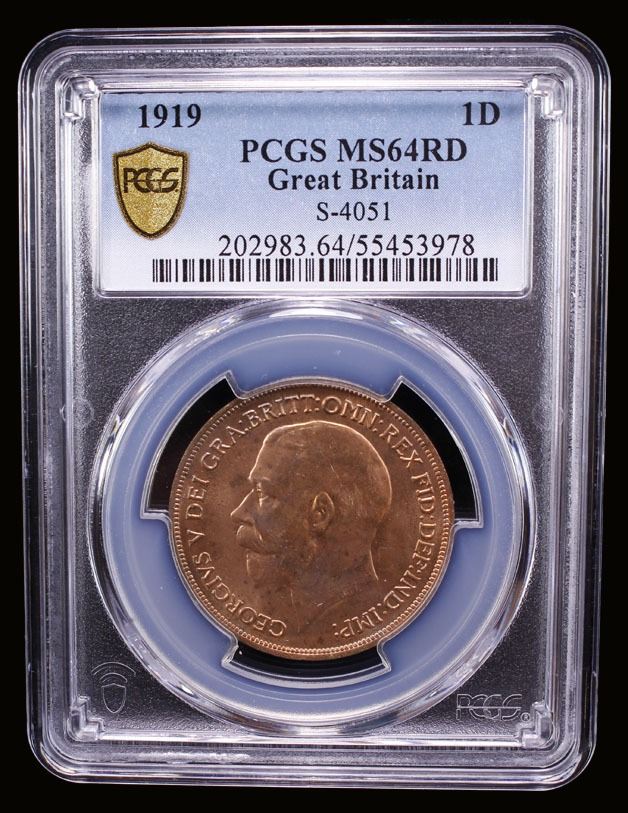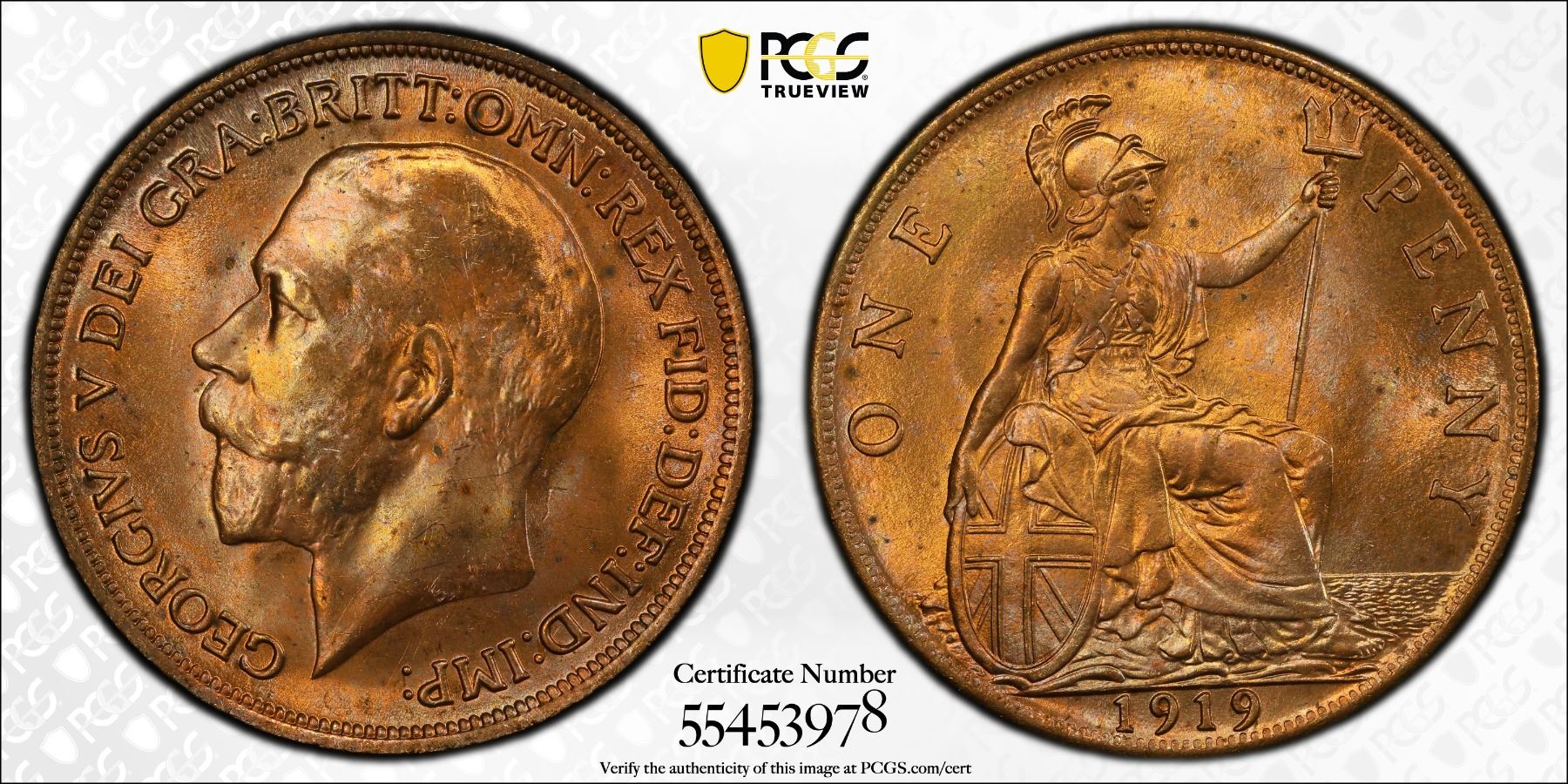 GREAT BRITAIN: George V, 1910-1936, AE penny, 1919, PCGS MS64 RD