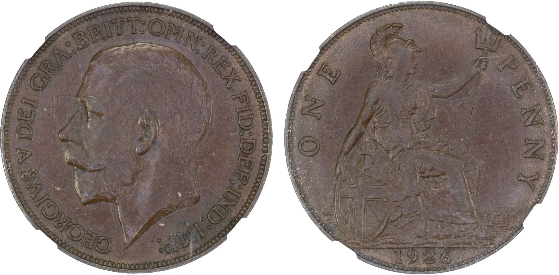 GREAT BRITAIN: George V, 1910-1936, AE penny, 1926, KM-826, modified bust variety, NGC graded AU53 BN.