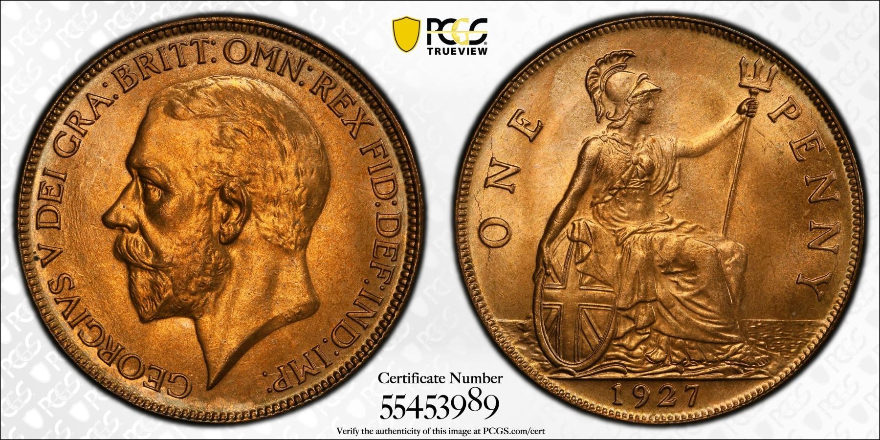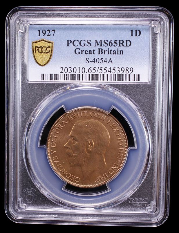 GREAT BRITAIN: George V, 1910-1936, AE penny, 1927, PCGS MS65 RD