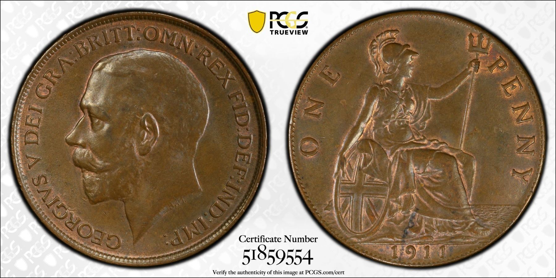 GREAT BRITAIN: George V, 1911-1936, AE penny, 1911, PCGS MS63 BN