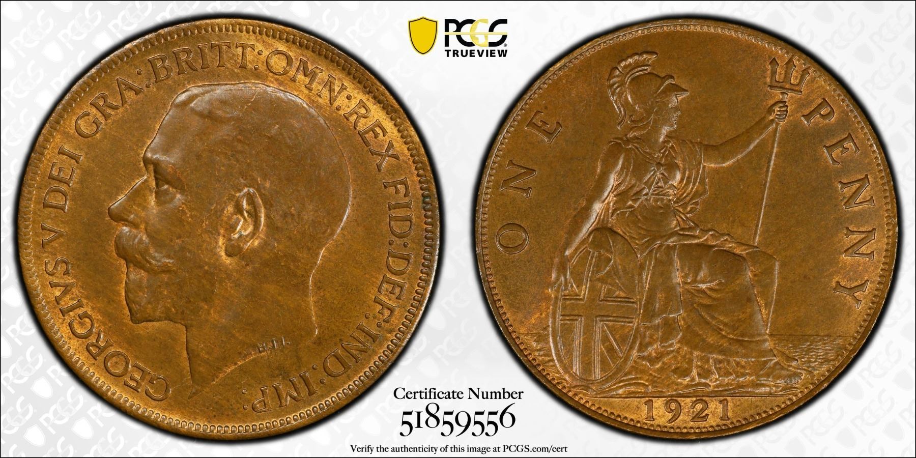 GREAT BRITAIN: George V, 1911-1936, AE penny, 1921, PCGS MS64 BN