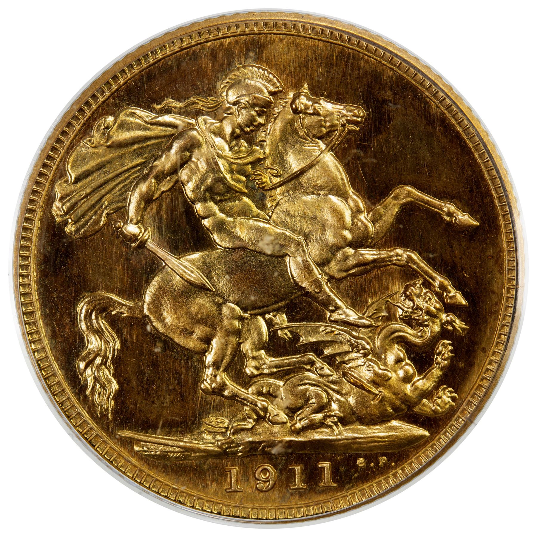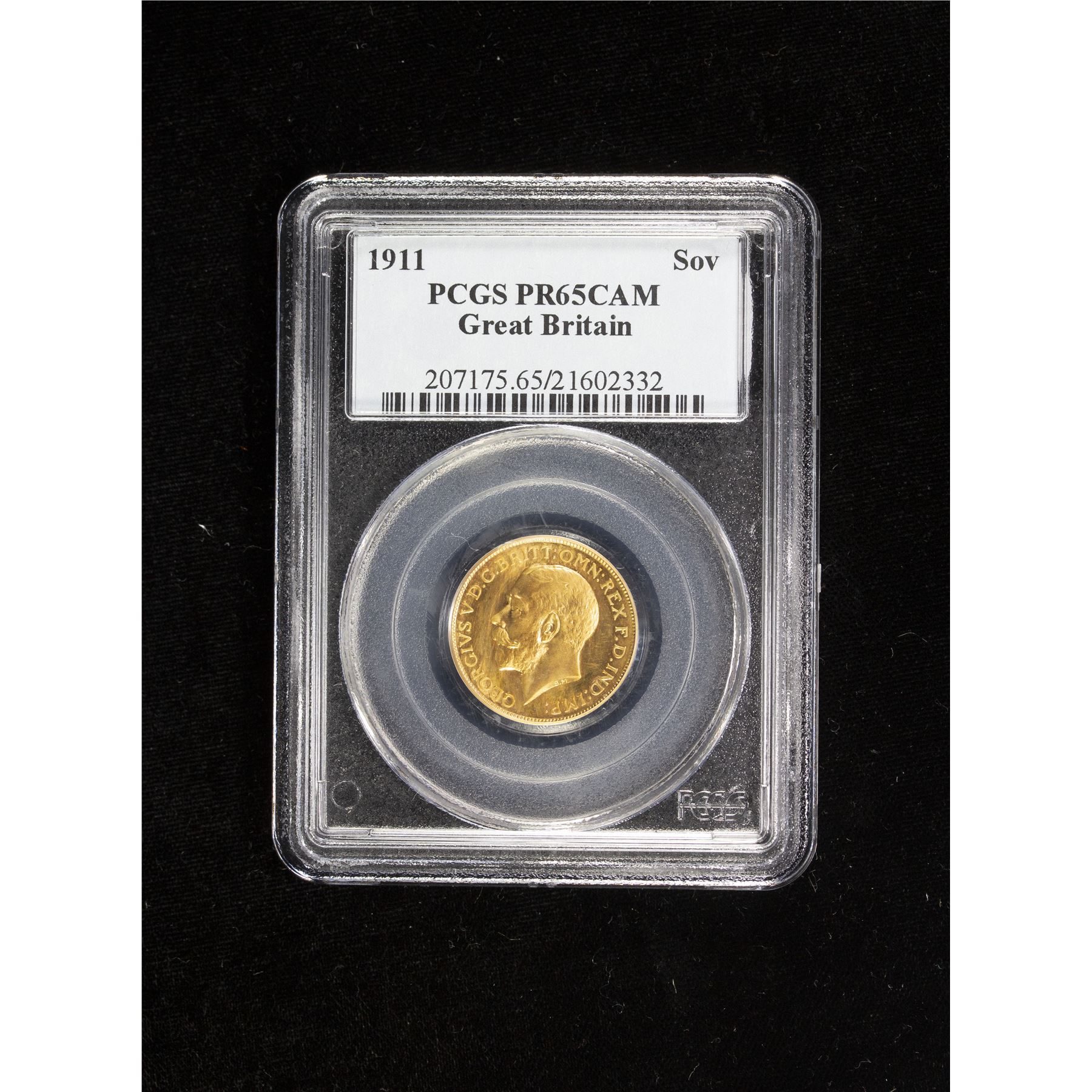 GREAT BRITAIN: George V, 1910-1936, AV sovereign, 1911, KM-820, S-3996, mintage of only 3,764 proof coins, a superb quality example with brilliant luster! PCGS graded Proof 65 CAM, S.