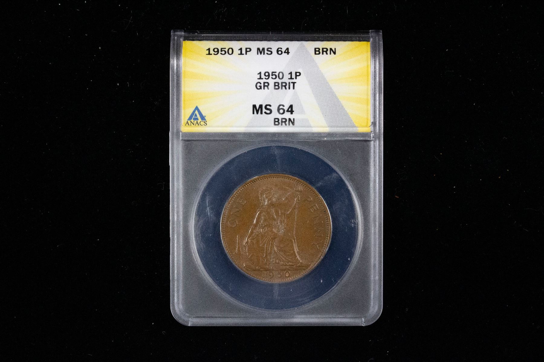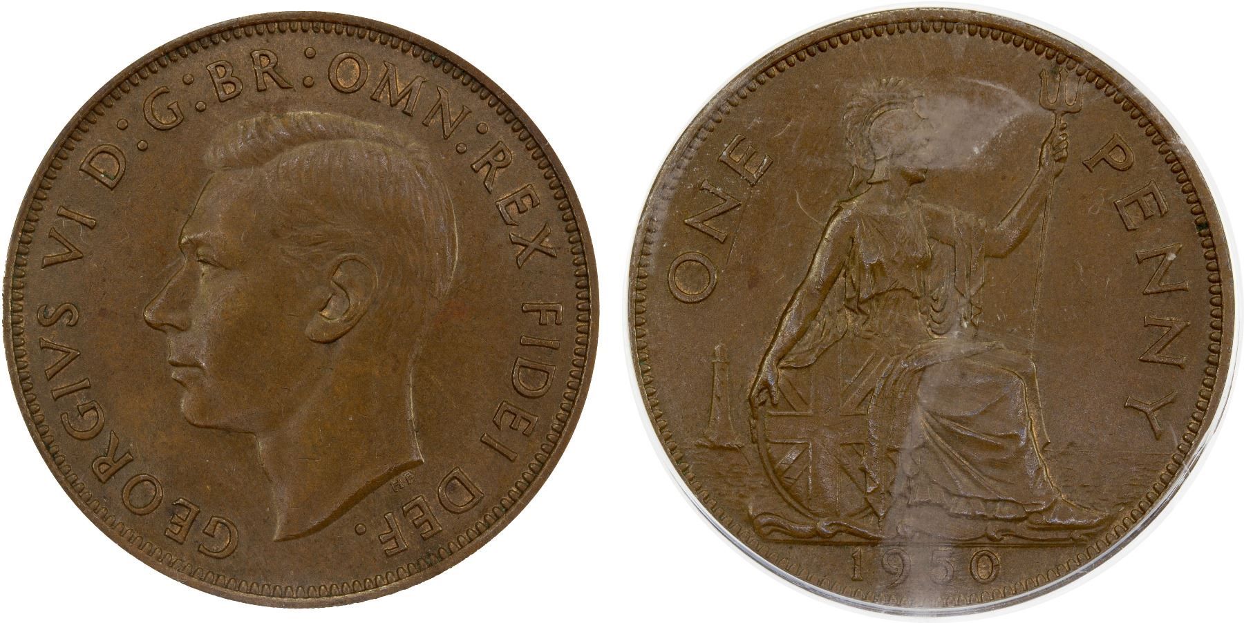 GREAT BRITAIN: George VI, 1936-1952, AE penny, 1950, KM-869, S-4117, a wonderful mint state example! ANACS graded MS64. The 1950 and 1951 circulation pennies were produced only for the colonies as none were needed in Britain. During 1956, the entire 1950 mintage, those still held in stock in Britain, and three-quarters of the 1951 production were sent to Bermuda.