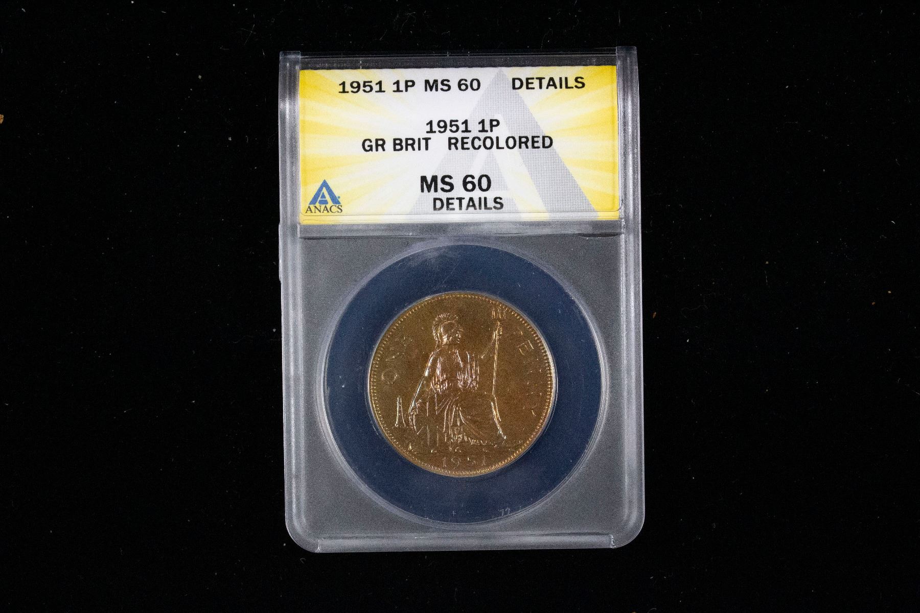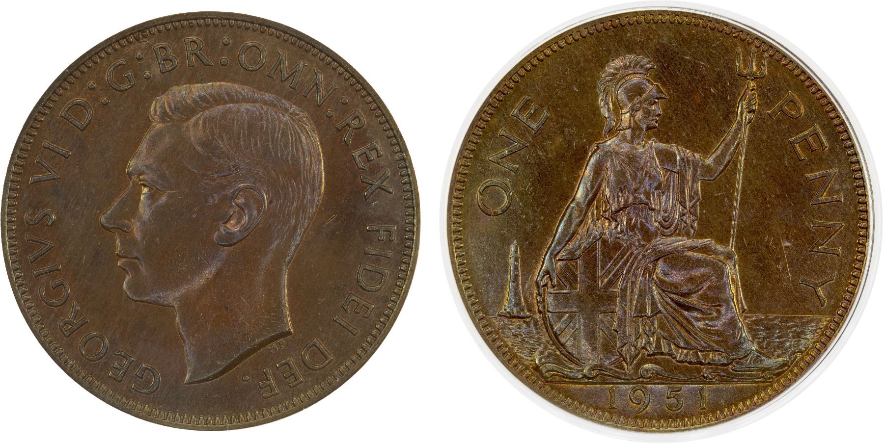 GREAT BRITAIN: George VI, 1936-1952, AE penny, 1951, KM-869, S-4117, artificial color, ANACS graded MS60 details. The 1950 and 1951 circulation pennies were produced only for the colonies as none were needed in Britain. During 1956, the entire 1950 mintage, those still held in stock in Britain, and three-quarters of the 1951 production were sent to Bermuda.