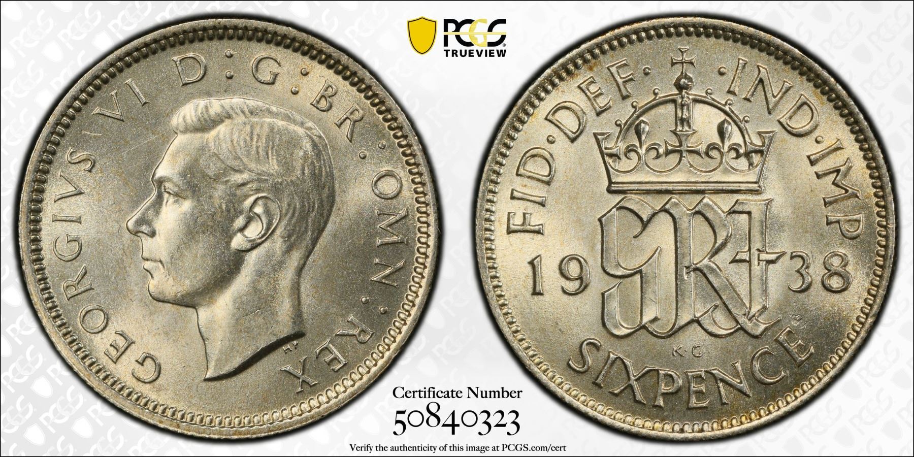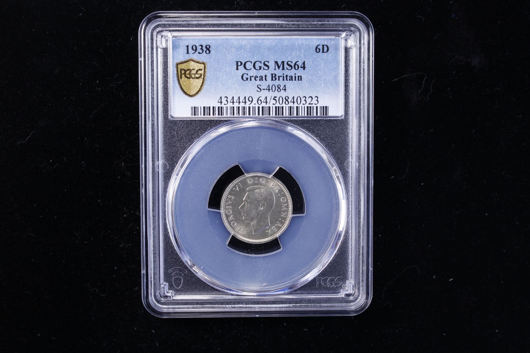 GREAT BRITAIN: George VI, 1936-1952, AR 6 pence, 1938, PCGS graded MS64