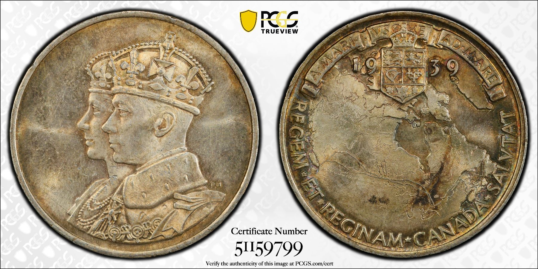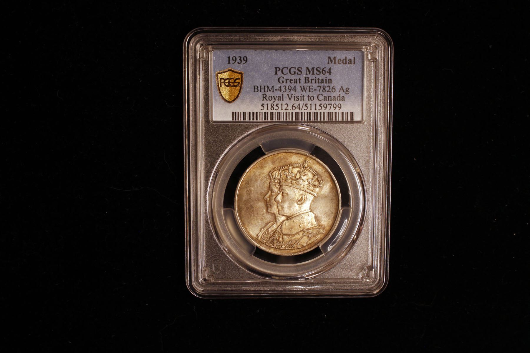 GREAT BRITAIN: George VI, 1936-1952, AR medal, 1939, BHM-4394, W&E-7826A3, 32mm, Royal Visit Medal by Percy Metcalf (obverse) and Emanuel Hahn (reverse), depicts a map of Canada and the route followed by the royal couple during their visit, PCGS graded MS64.