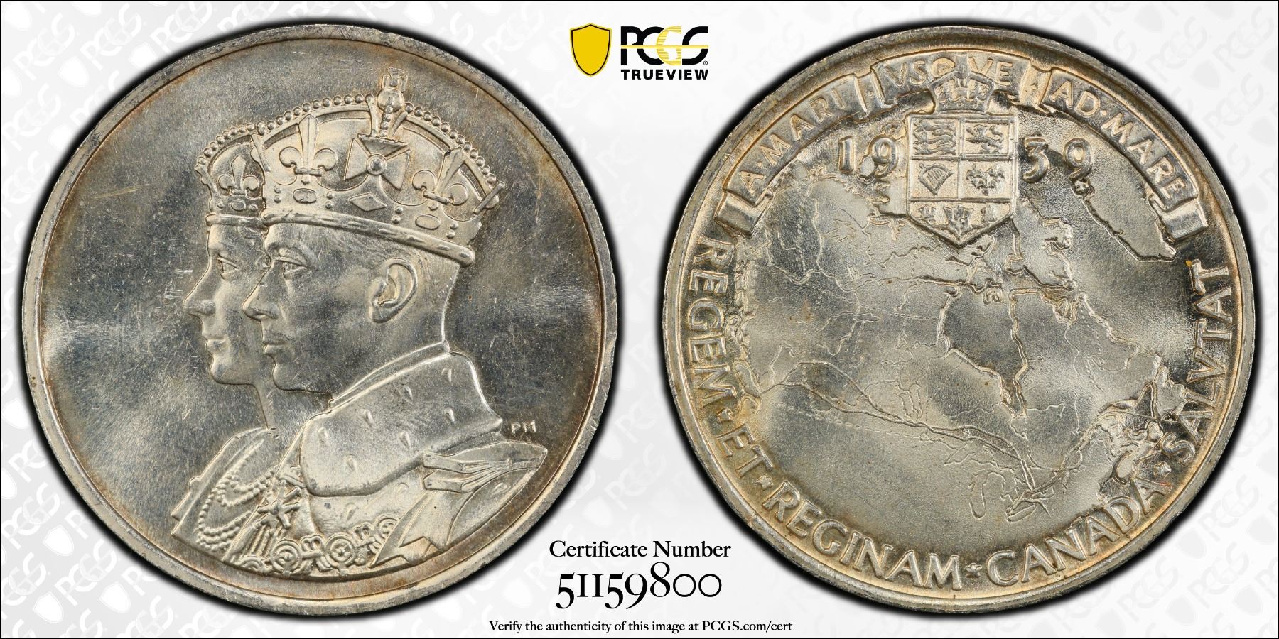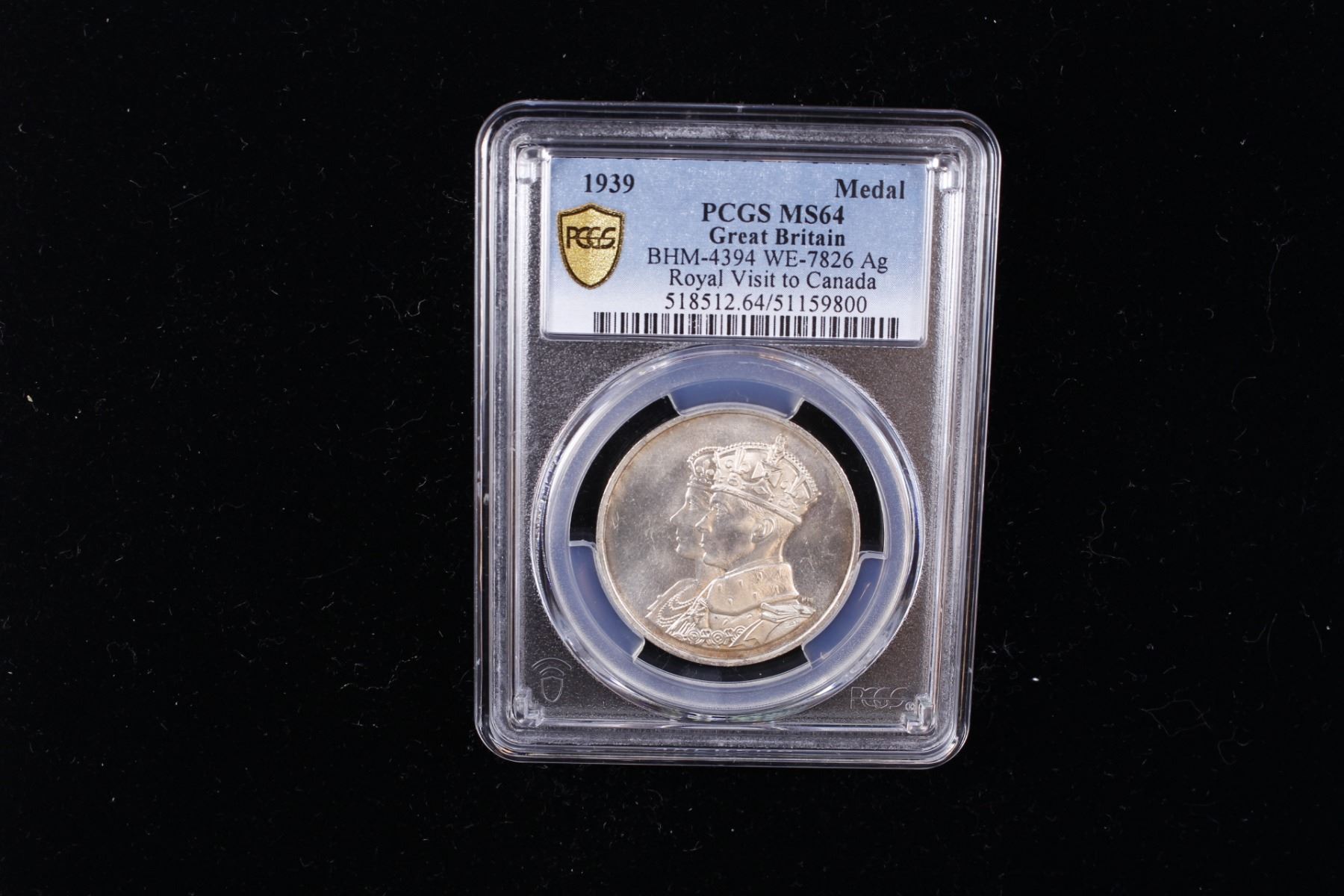 GREAT BRITAIN: George VI, 1936-1952, AR medal, 1939, BHM-4394, W&E-7826A3BHM-4394, W&E-7826A3, 32mm, Royal Visit Medal by Percy Metcalf (obverse) and Emanuel Hahn (reverse), depicts a map of Canada and the route followed by the royal couple during their visit, PCGS graded MS64.