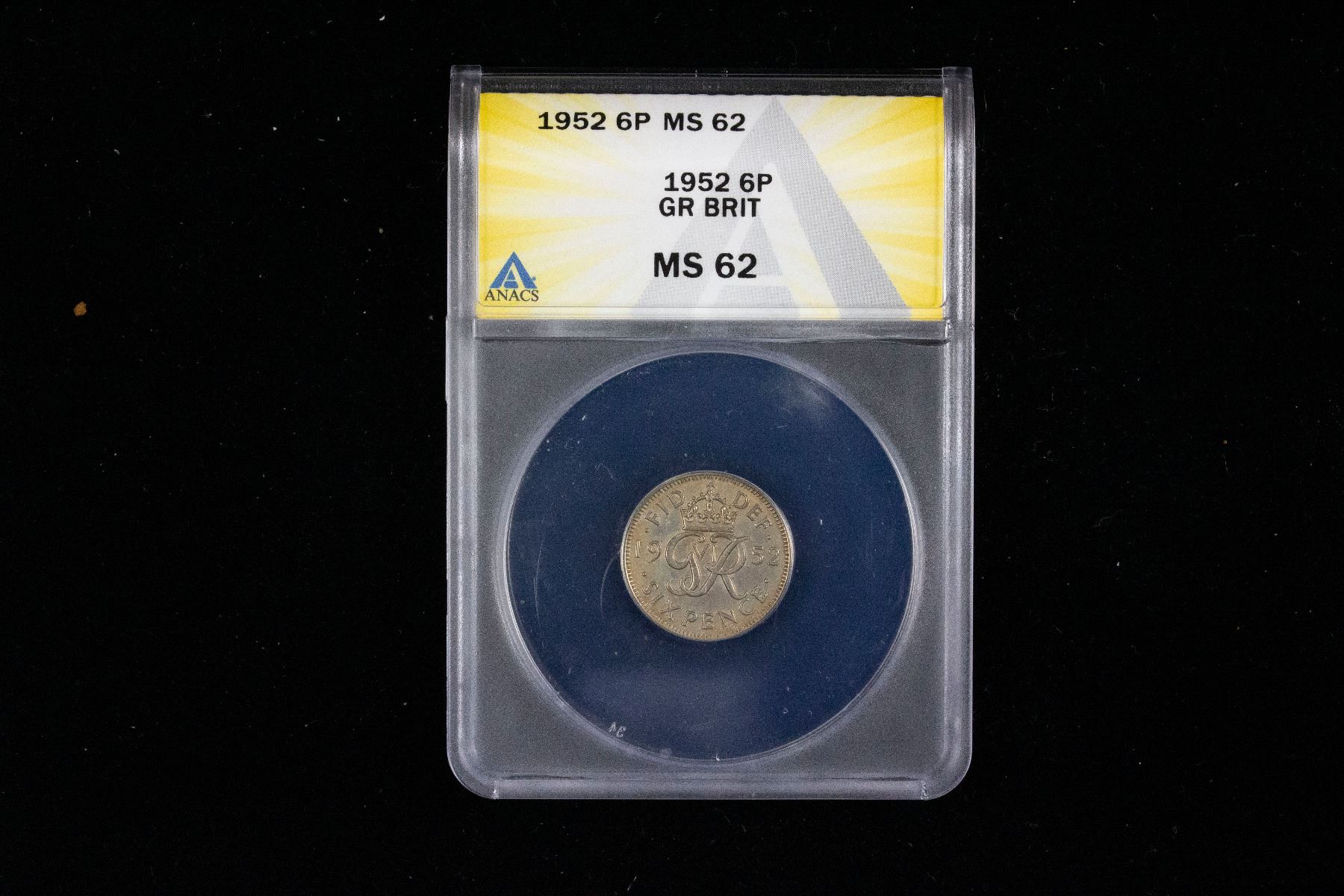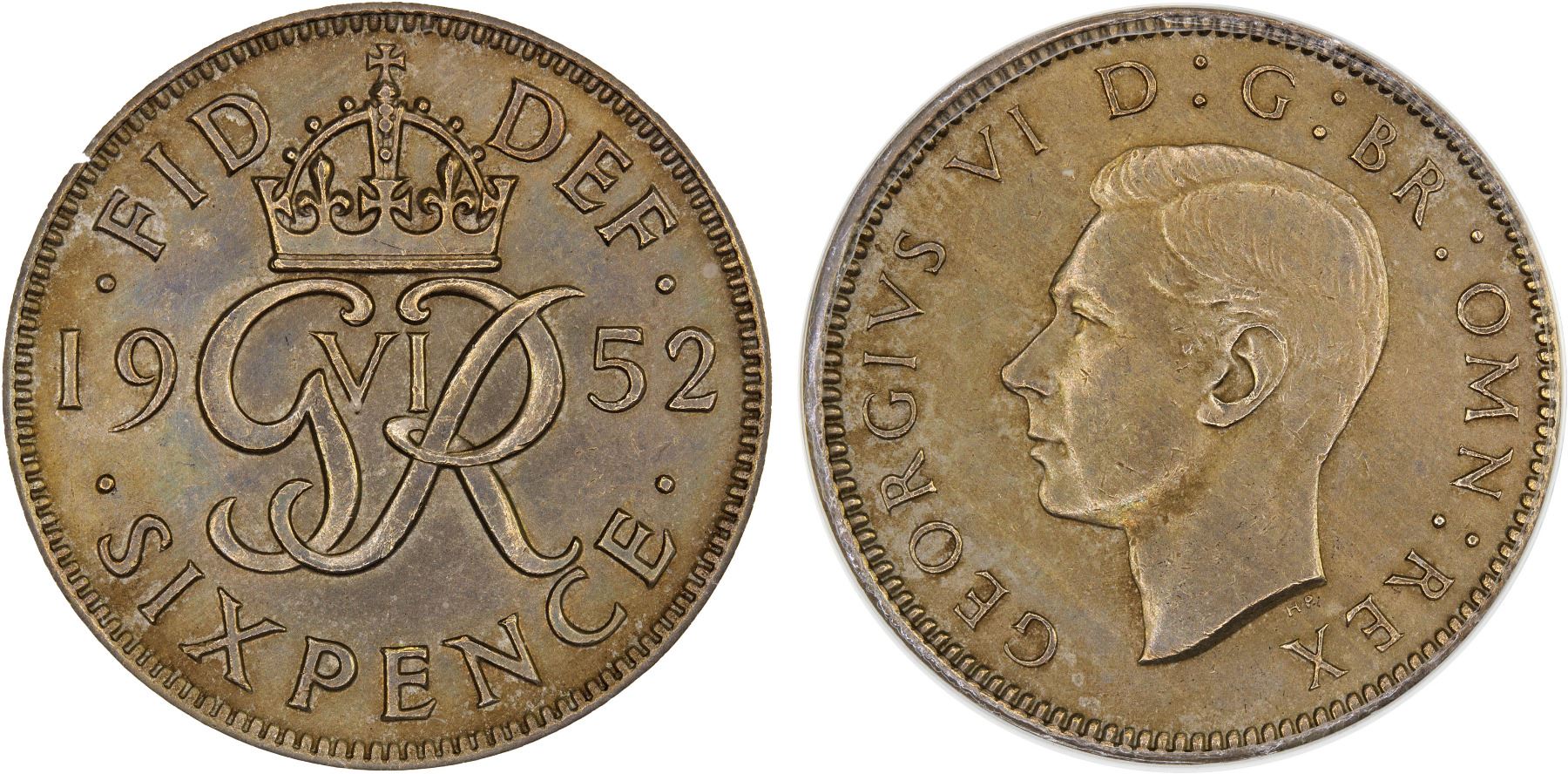 GREAT BRITAIN: George VI, 1936-1952, sixpence, 1952, KM-875, S-4110, a pleasing mint state example, ANACS graded MS62