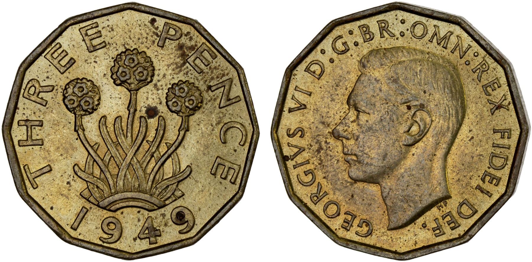 GREAT BRITAIN: George VI, 1936-1952, threepence, 1949, Unc