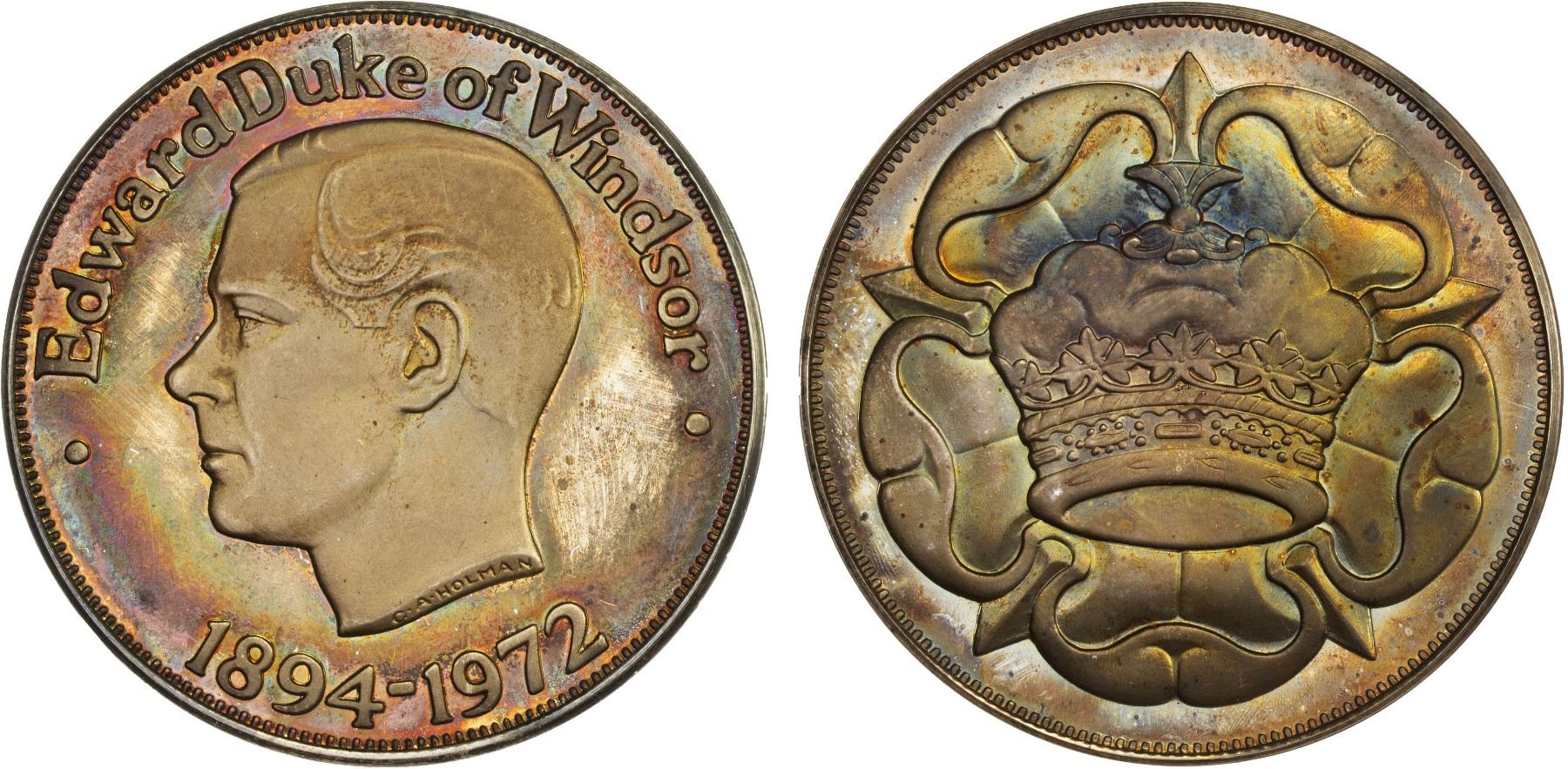 GREAT BRITAIN: John Pinches & Co. Medals, AR medal (27.03g), "1936" (1972), Giordano-CM380a, 39mm sterling silver medal for the Death of Edward VIII by G. A. Holman for John Pinches & Co., bust left with "Edward Duke of Windsor. 1894-1972 ." around // large crown on Tudor rose, contains approximately 0.80oz pure silver, attractive blue and orange tone, plain edge, Proof.