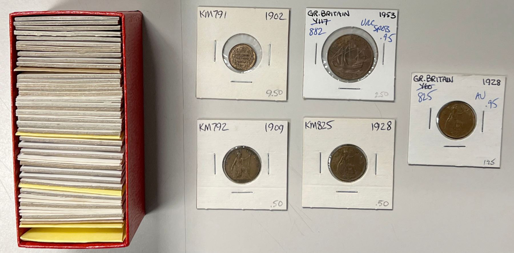 GREAT BRITAIN: LOT of 58 coins, including 1/3 farthing (1 pc), farthing (5), halfpenny (10), penny (14), threepence (9), sixpence (6), shilling (4), florin (4), and halfcrown (5); average circulated grades, with many uncs and a few proofs, in consignor's 2x2 holders, viewing recommended; retail value $1025, lot of 58 pieces.