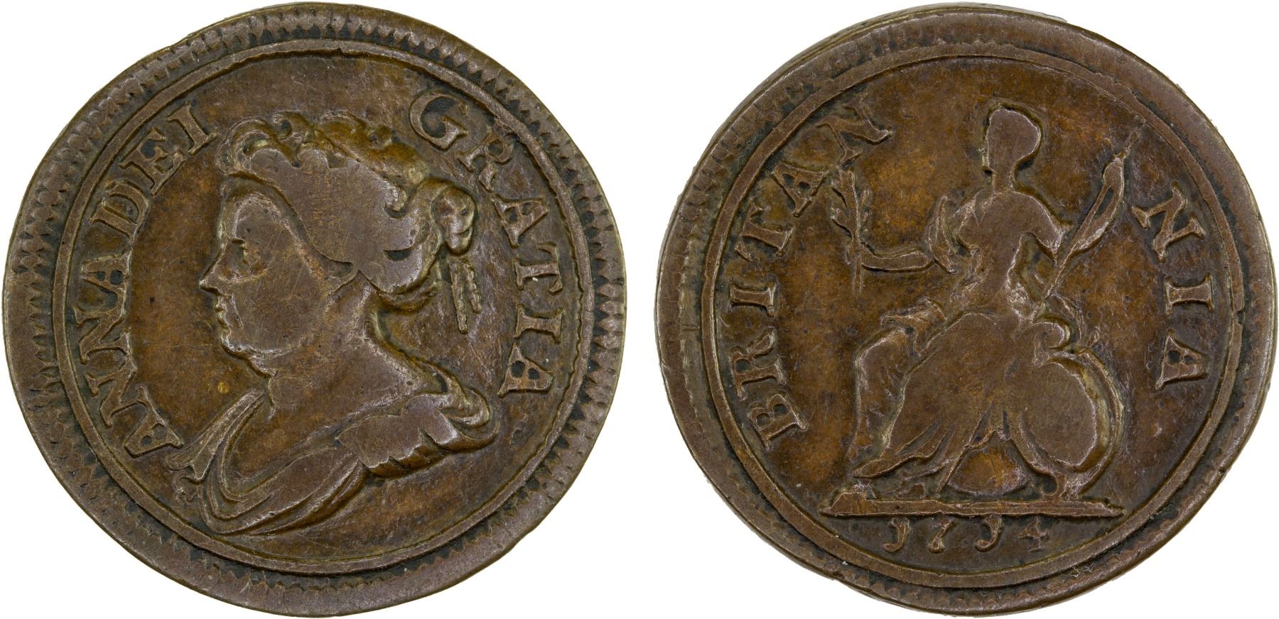 GREAT BRITAIN: Old Imitations, AE farthing (3.40g), "1714", as KM-537, as Spink-3625, old cast imitation of rare pattern issue of Anne (1702-1714), Fine, ex SARC Auction 49, Lot 2973.