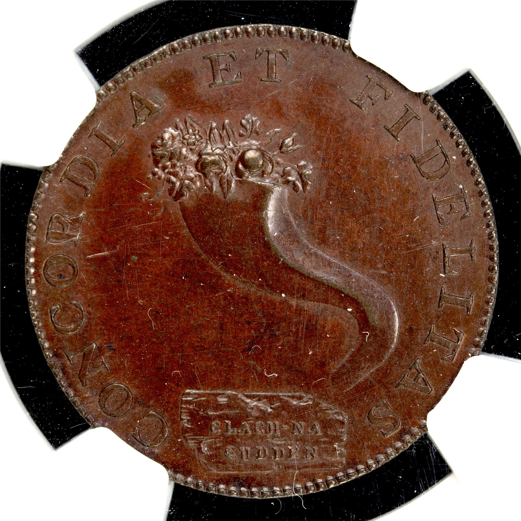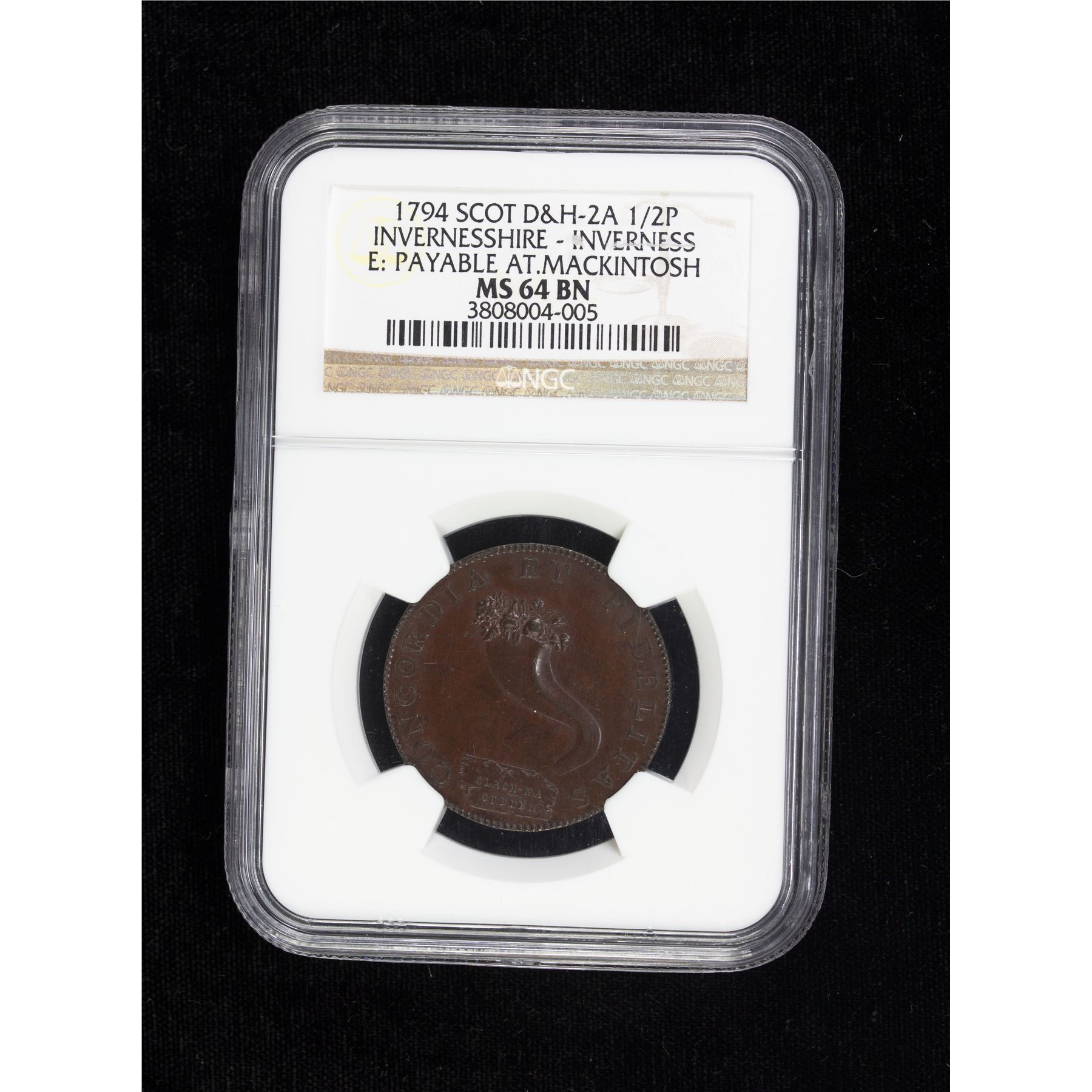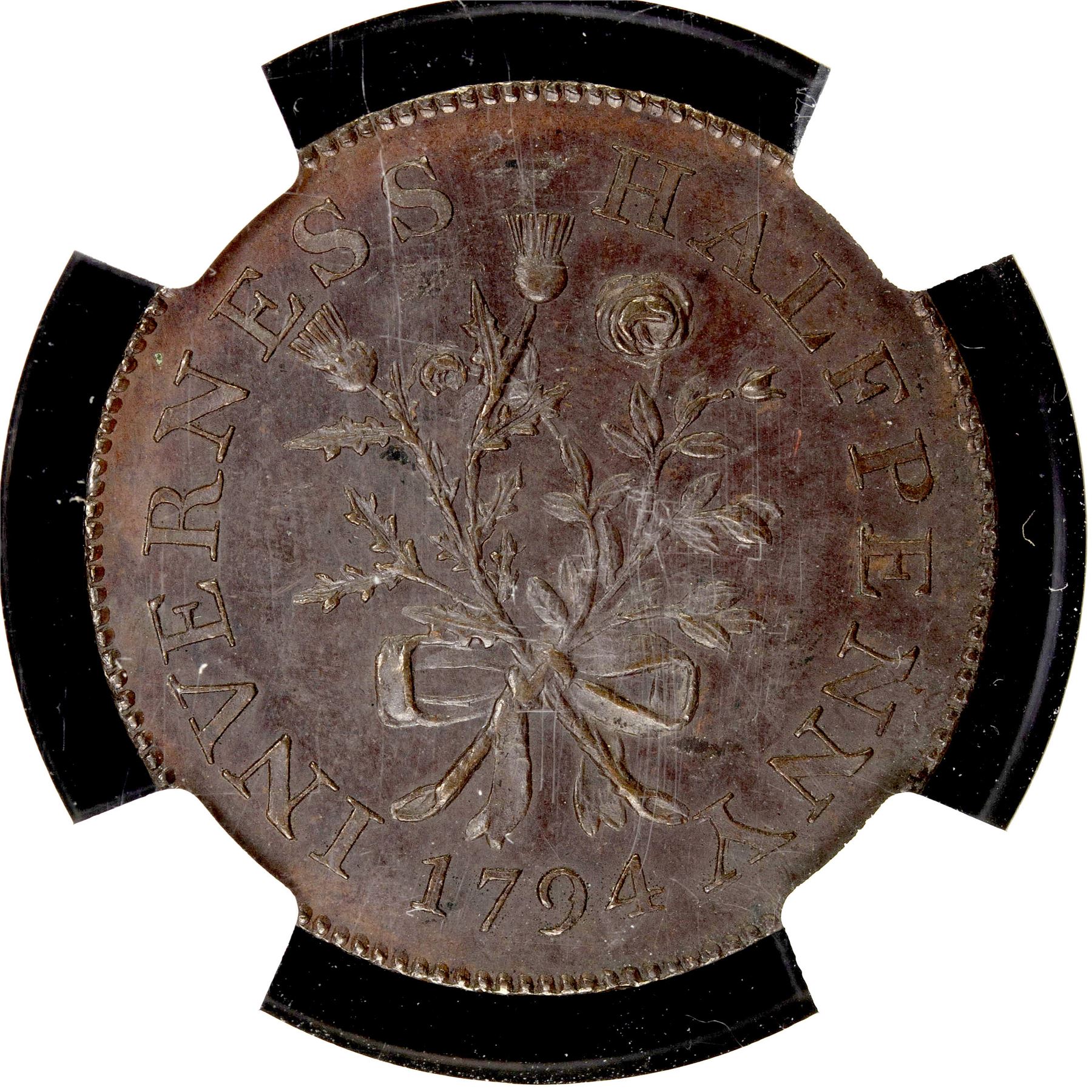 GREAT BRITAIN: SCOTLAND: Invernessshire, AE halfpenny token, 1794, D&H-2a, Inverness, thistle bouquet with "INVERNESS HALFPENNY - 1794" around // cornucopia with CONCORDIA ET FIDELITAS around and CLACH-NA / CUDDEN on stone at bottom, PAYABLE AT MACINTOSH INGLIS AND WILSON'S on edge, nice glossy, chocolate-brown surfaces, NGC graded MS64 BN.