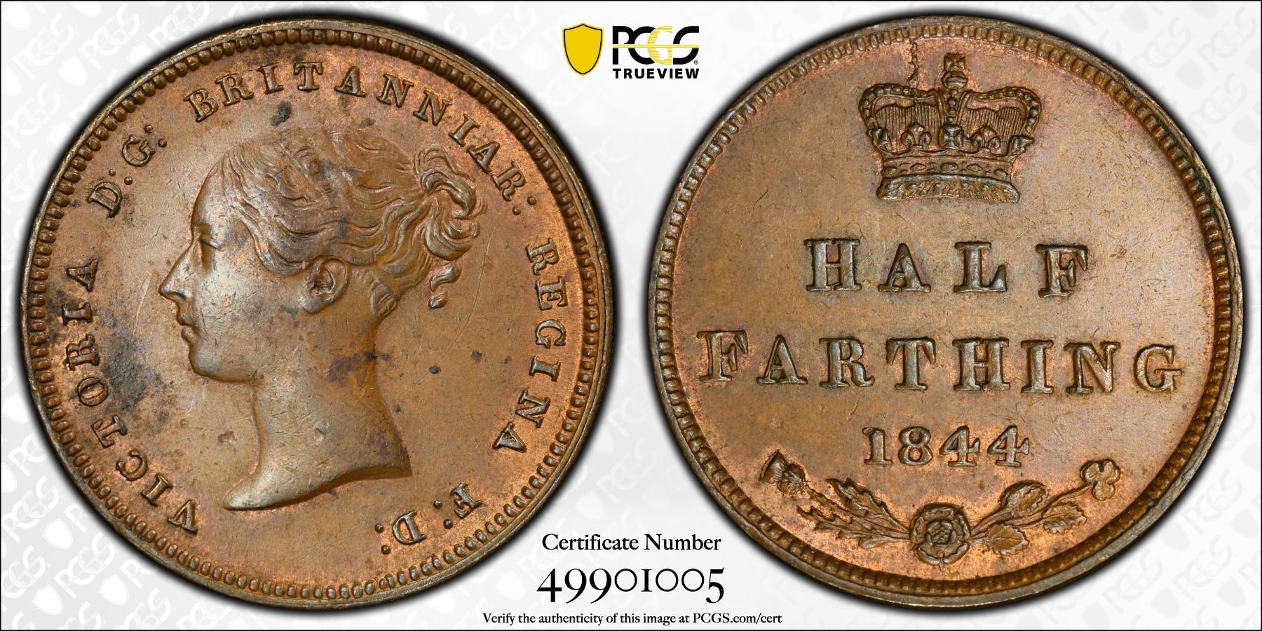 GREAT BRITAIN: Victoria, 1837-1901, AE 1/2 farthing, 1844, PCGS MS62 BN