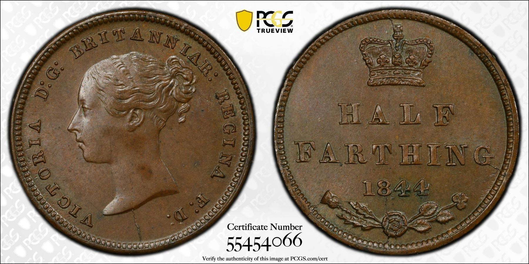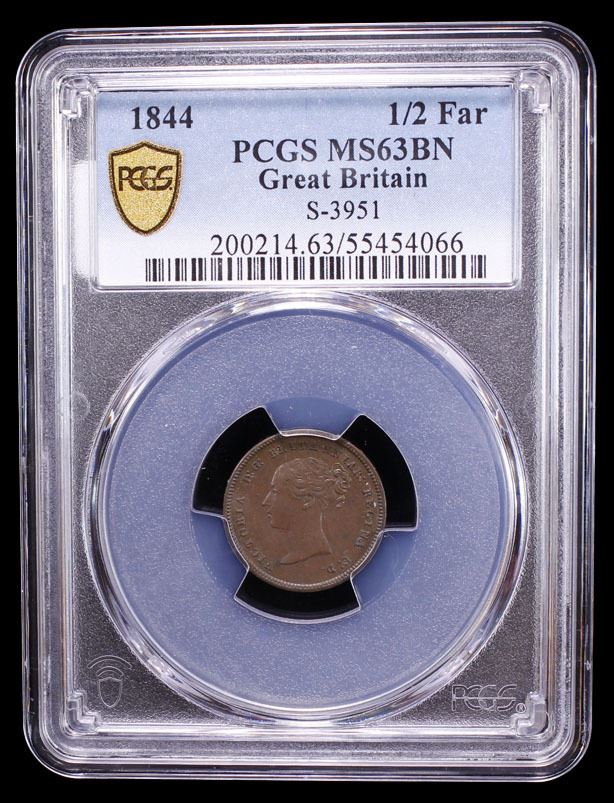 GREAT BRITAIN: Victoria, 1837-1901, AE 1/2 farthing, 1844, PCGS MS63 BN