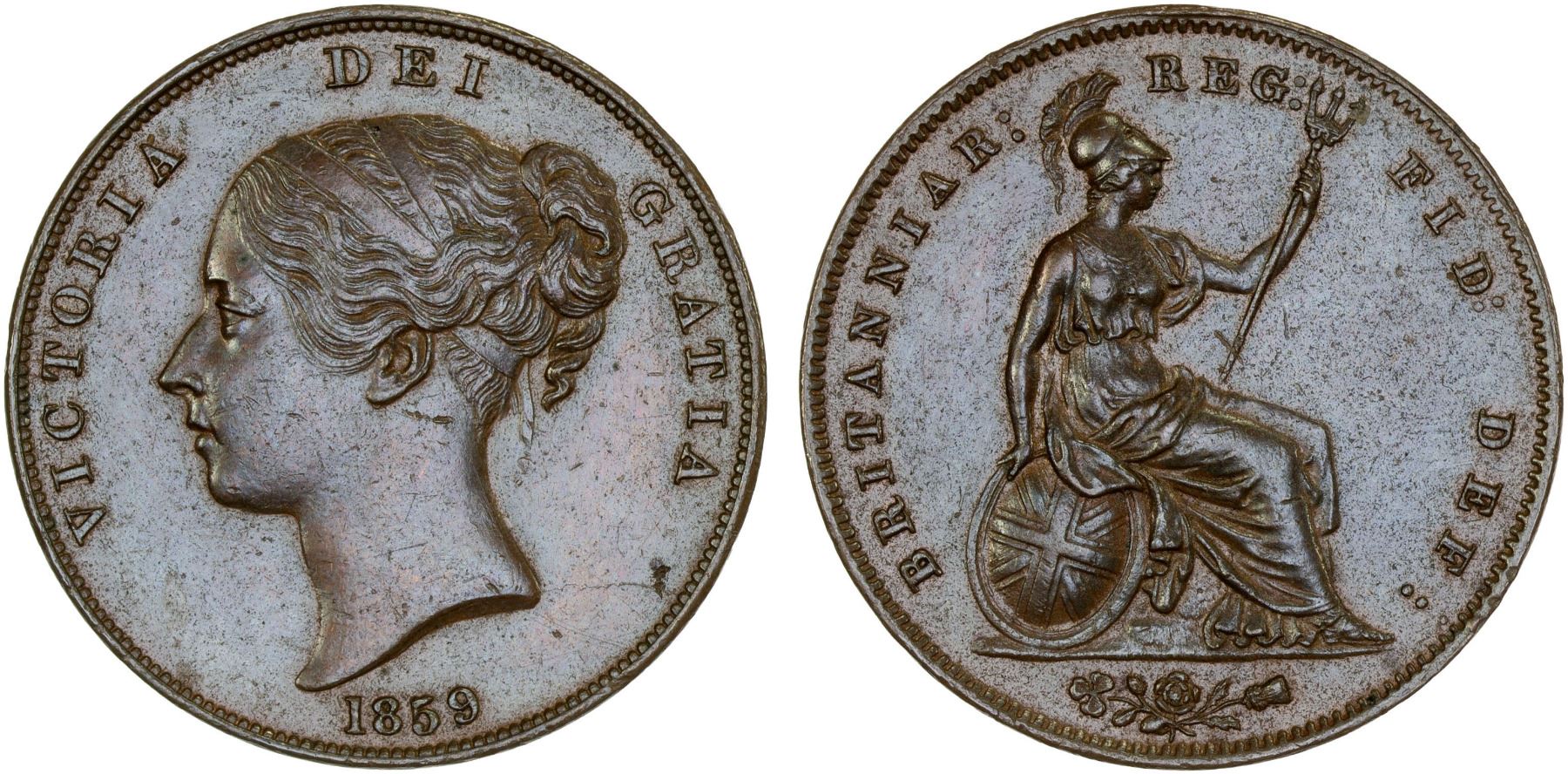 GREAT BRITAIN: Victoria, 1837-1901, AE penny, 1859, AU