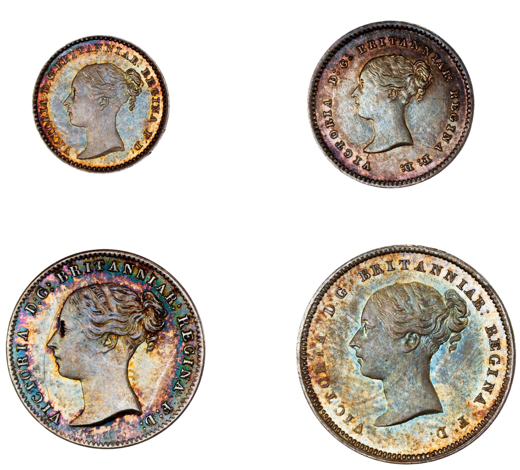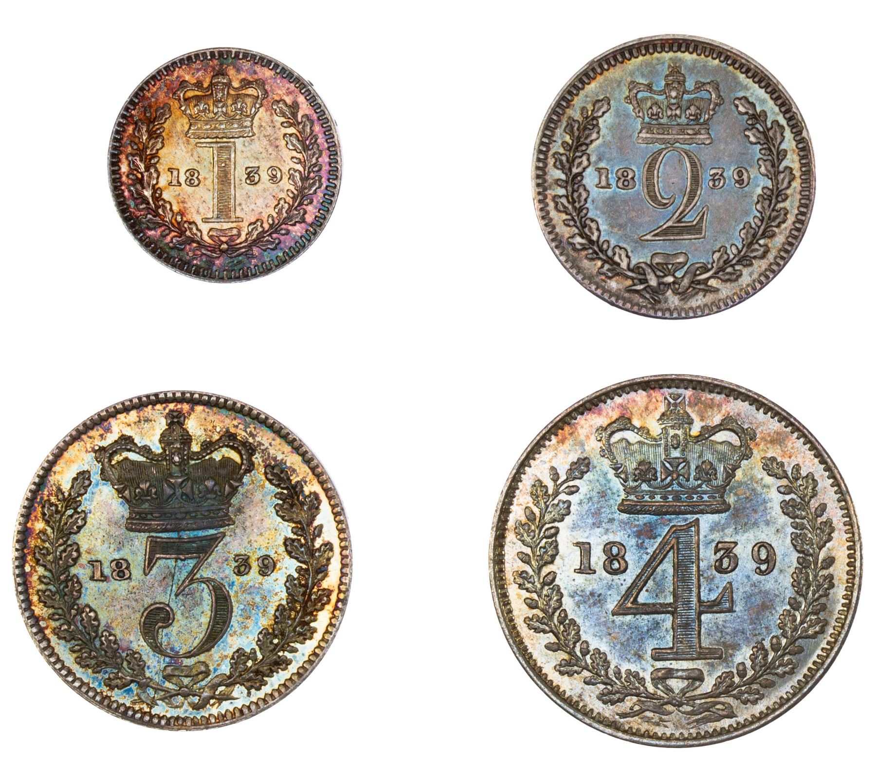 GREAT BRITAIN: Victoria, 1837-1901, AR maundy set, 1839, KM-MDS88, Spink-3916, all are toned, two- and threepence are lightly cleaned, average extremely fine to almost uncirculated, mintage of only 4,125 sets, scarce, set of 4 coins.