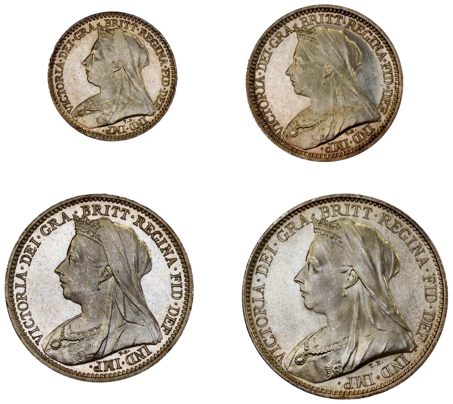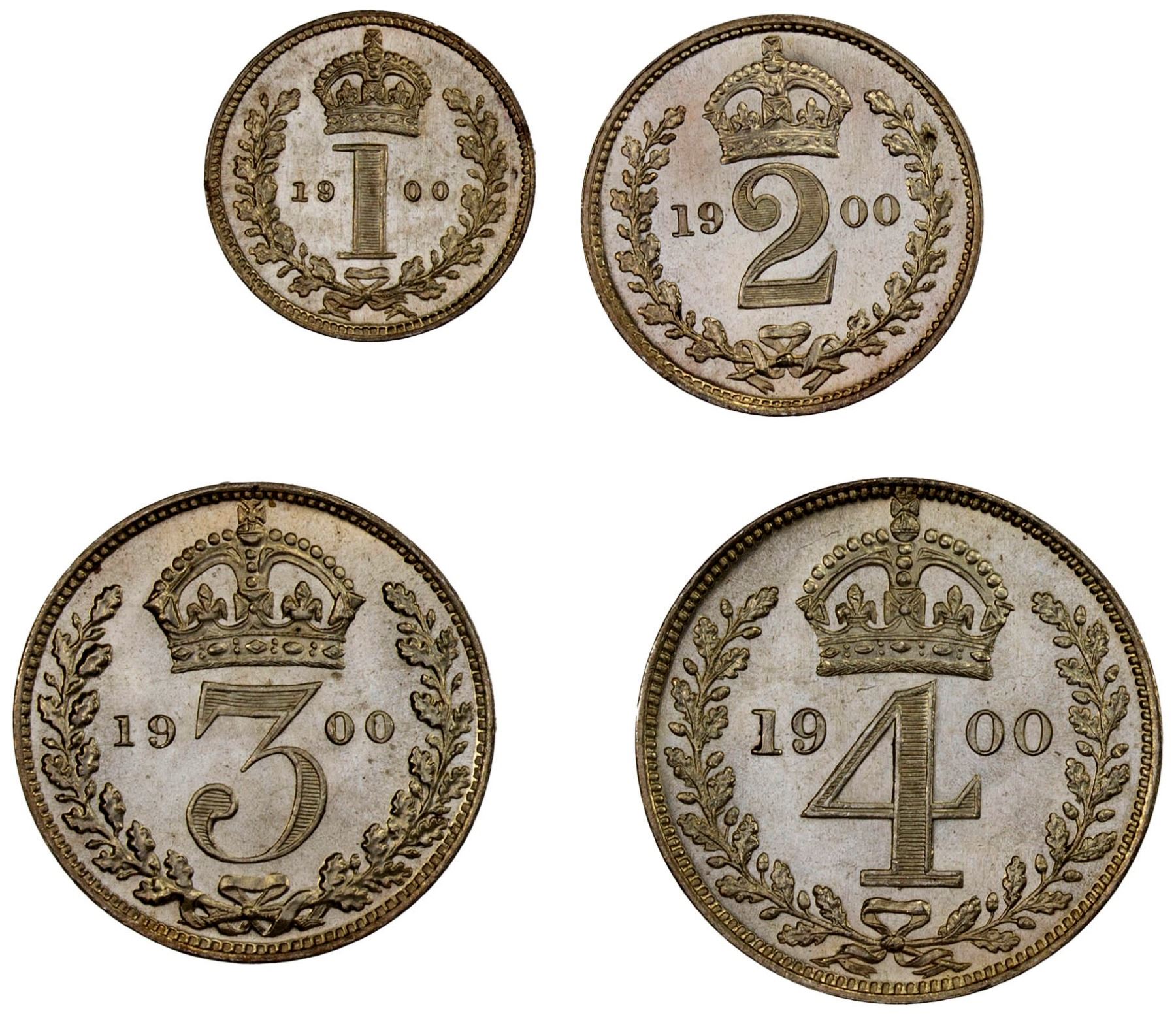 GREAT BRITAIN: Victoria, 1837-1901, AR maundy set, 1900, KM-MDS156, Spink-3943, veiled head type, a few wispy hairlines, otherwise a choice set, outstanding luster, well matched, mintage of only 8,976 sets, sscarce, set of 4 coins, Choice UNC, ex Heritage Auction 231536, Lot 61181, ex Bob Bennett Collection.