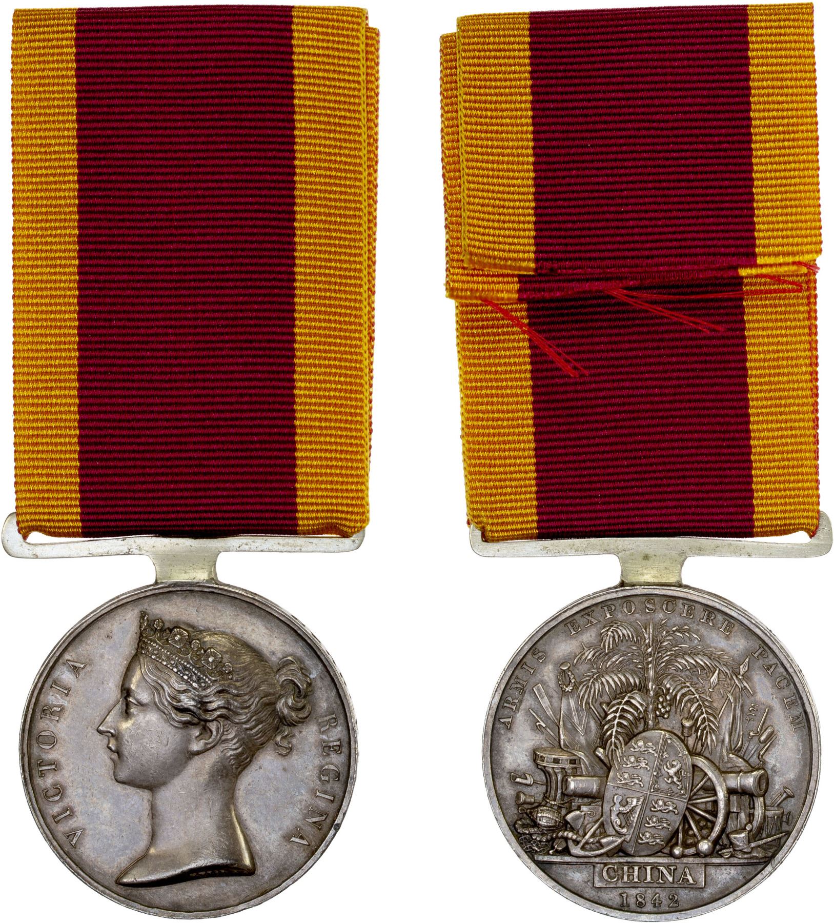 GREAT BRITAIN: Victoria, 1837-1901, AR medal, 1842, MY-110, The China War Medal; diademed head of Queen Victoria with the legend VICTORIA REGINA // shield bearing the Royal coat of arms with a palm tree and trophy of arms behind, with the inscription ARMIS EXPOSCERE PACIM above and CHINA / 1842 in the exergue below, a non-swiveling suspender is plain and straight being sweated directly to the medal as made, with new ribbon, awarded to GEORGE PARKINS, H.M.S BELLEISLE, AU. The China War Medal was issued by the British Government in 1843 to members of the British and Indian forces who took part in the First Opium War (1839-42). The medal was designed by William Wyon. In 1843, under the direction of Queen Victoria, the British Government authorized its award to all members of the British Army, Royal Navy and the Indian Army and Navy, who had belonged to units that had "served with distinction" in China between July 5, 1840 and August 29, 1842. This campaign became known as the First Opium War, ending in the seizure of Nanking. The resultant treaty opened five ports to trade, and ceded Hong Kong to Great Britain.The HMS Belleisle was converted to serve as a troopship in 1841 and sailed for China in Dec. 1841 for the First Opium War. She stayed in China until the Treaty of Nanking was signed in 1842.