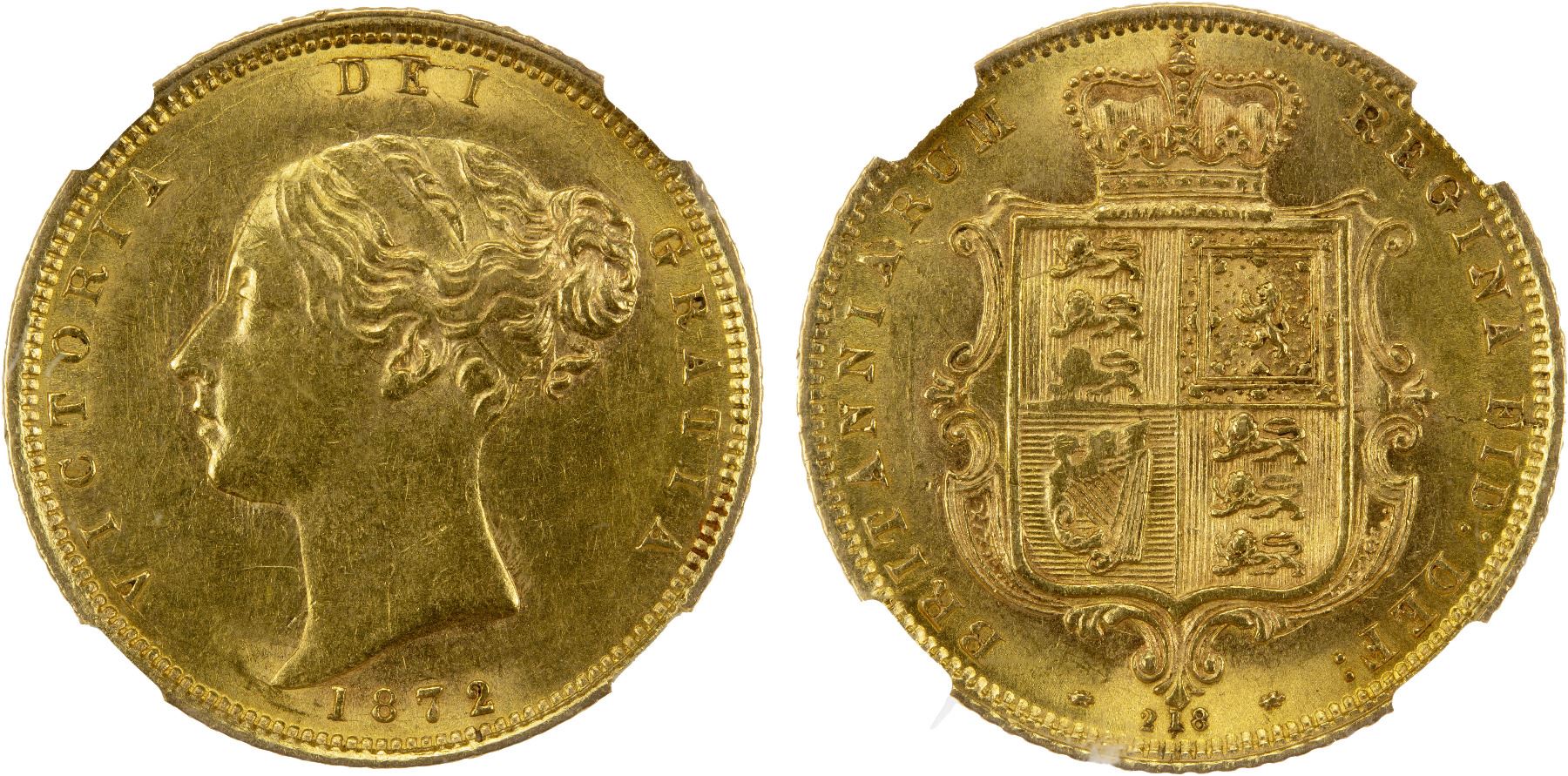 GREAT BRITAIN: Victoria, 1837-1901, AV 1/2 sovereign, 1872, KM-735.2, S-3860D, die number 218, lovely and lustrous, NGC graded AU58, ex Salvatore J. Falcone Collection.