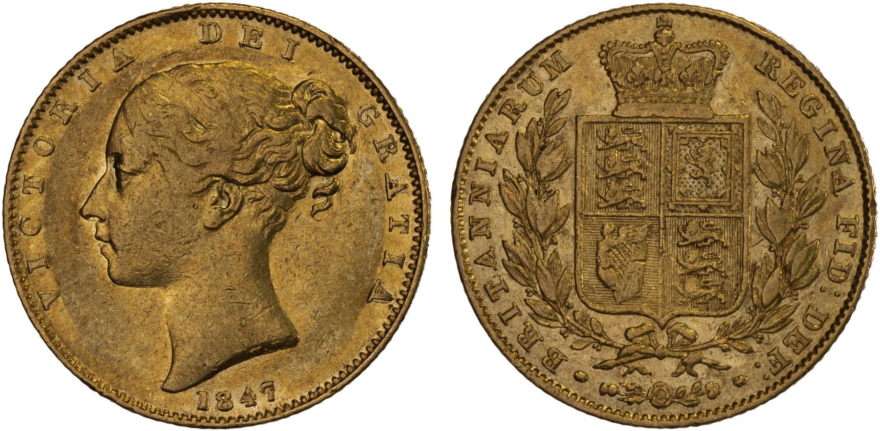 GREAT BRITAIN: Victoria, 1837-1901, AV sovereign, 1847, KM-736.1, S-3852, shield type, VF-XF.