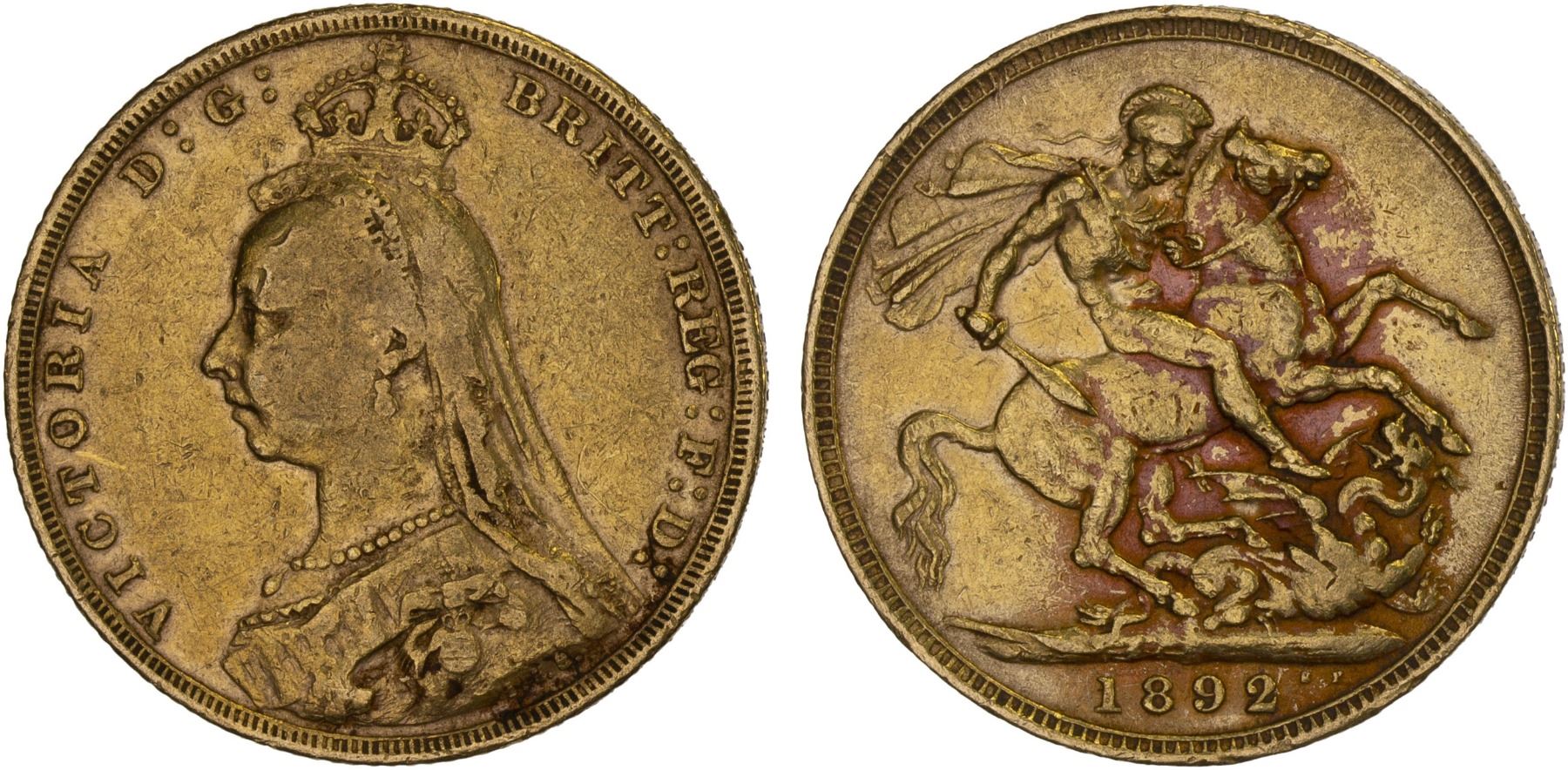 GREAT BRITAIN: Victoria, 1837-1901, AV sovereign, 1892, KM-767, S-3866, VF, ex Syed Rabbi Collection.