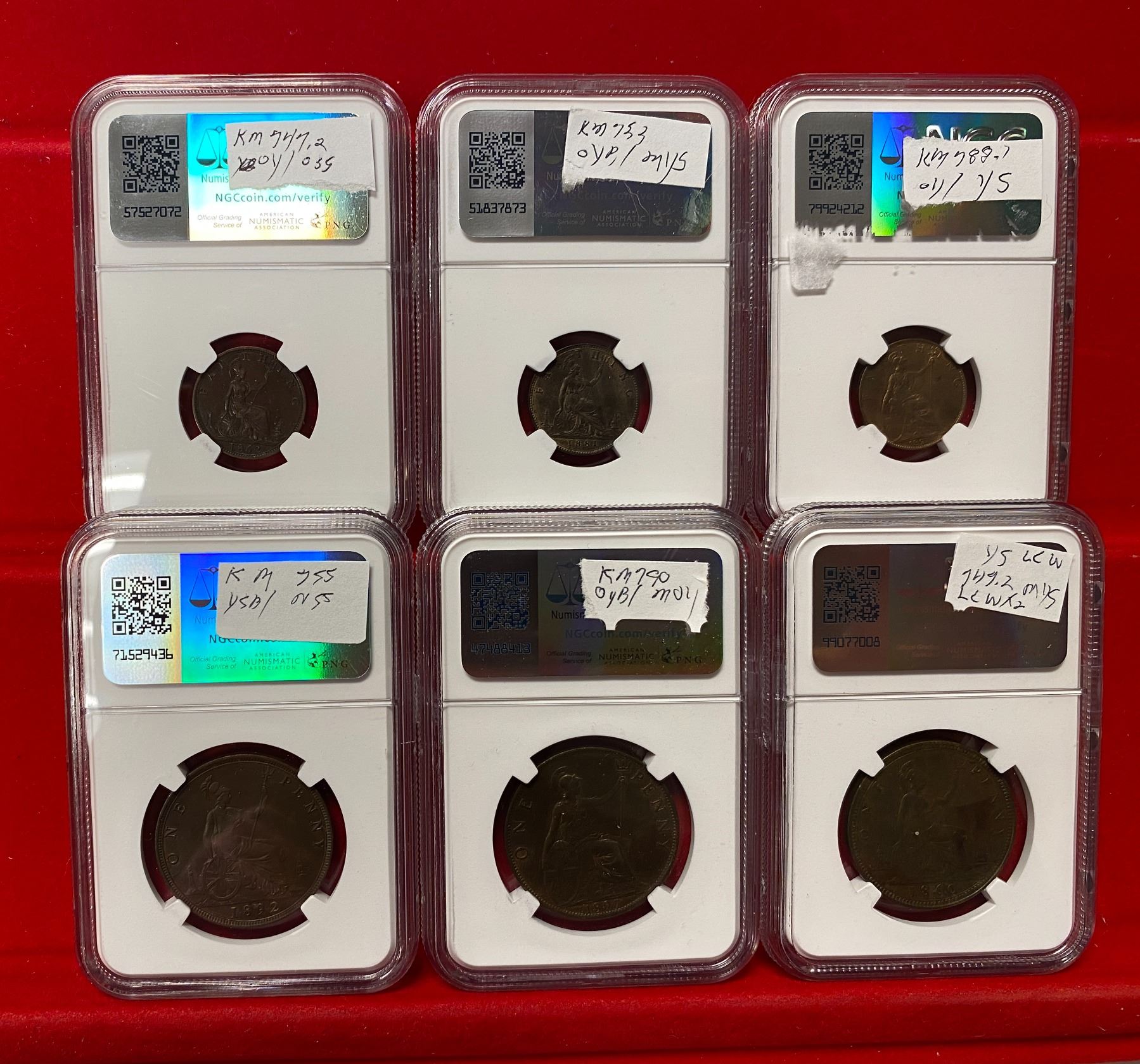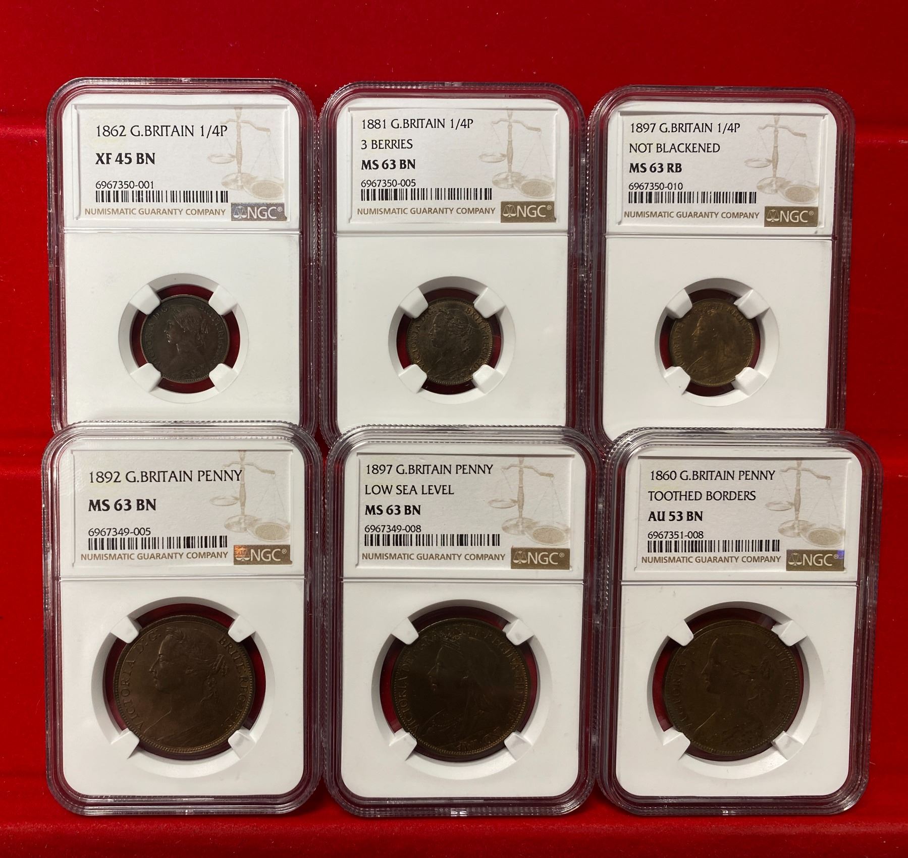 GREAT BRITAIN: Victoria, 1837-1901, LOT of 6 NGC certified coins, including 6 types; 3 farthings - 1862 small 8 (NGC XF45 BN), 1881 three berries (NGC 63 BN), and 1897 not blackened (NGC 63 RB) and 3 pennies - 1860 toothed border (NGC AU 53 BN), 1897 low sea level (NGC 63 BN), and 1892 (NGC 63 BN); retail value $400, lot of 6 pieces.