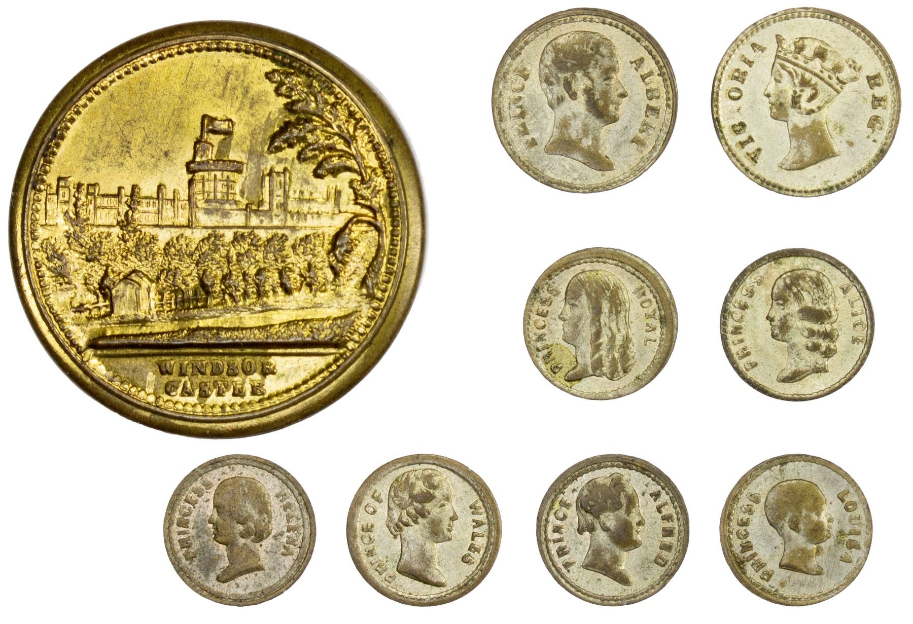 GREAT BRITAIN: Victoria, 1837-1901, box medal and miniatures, ND (ca. 1850's), 23mm Windsor Castle box medal in gilt brass including 8 miniature medals in silvered brass of Victoria and Albert and 6 of their children by Joseph Moore, AU, ex Davissons E-Auction 41, Lot 215 (with tag). Victoria and Albert's children represented here are Prince Alfred, Princess Louisa, Prince of Wales Albert (the future King Edward VII), Princess Helena, Princess Royal Victoria, and Princess Alice.