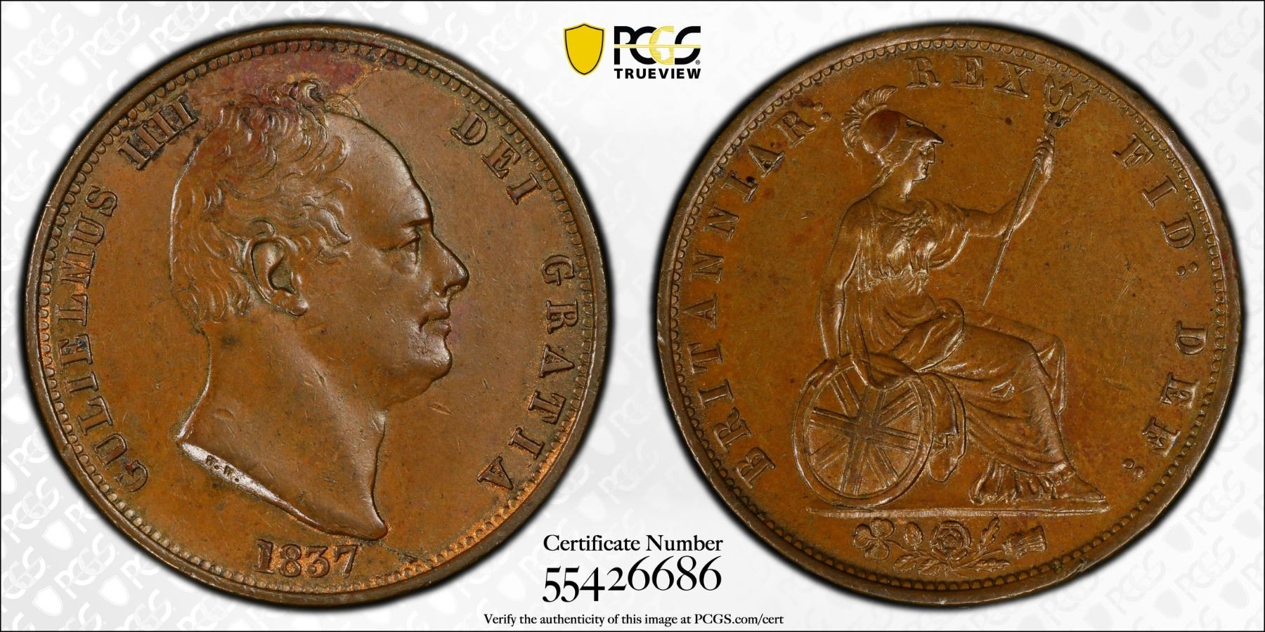 GREAT BRITAIN: William IV, 1830-1837, AE 1/2 penny, 1837, PCGS AU58