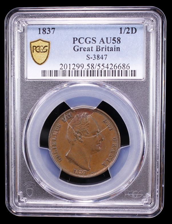 GREAT BRITAIN: William IV, 1830-1837, AE 1/2 penny, 1837, KM-706, S-3847, PCGS graded AU58.