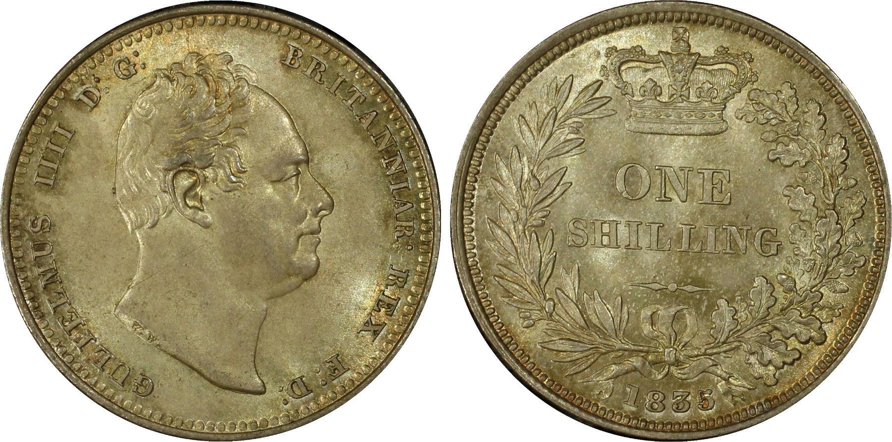 GREAT BRITAIN: William IV, 1830-1837, AR shilling, 1835, KM-713, S-3835, a wonderful lustrous lightly toned example! PCGS graded MS64+.