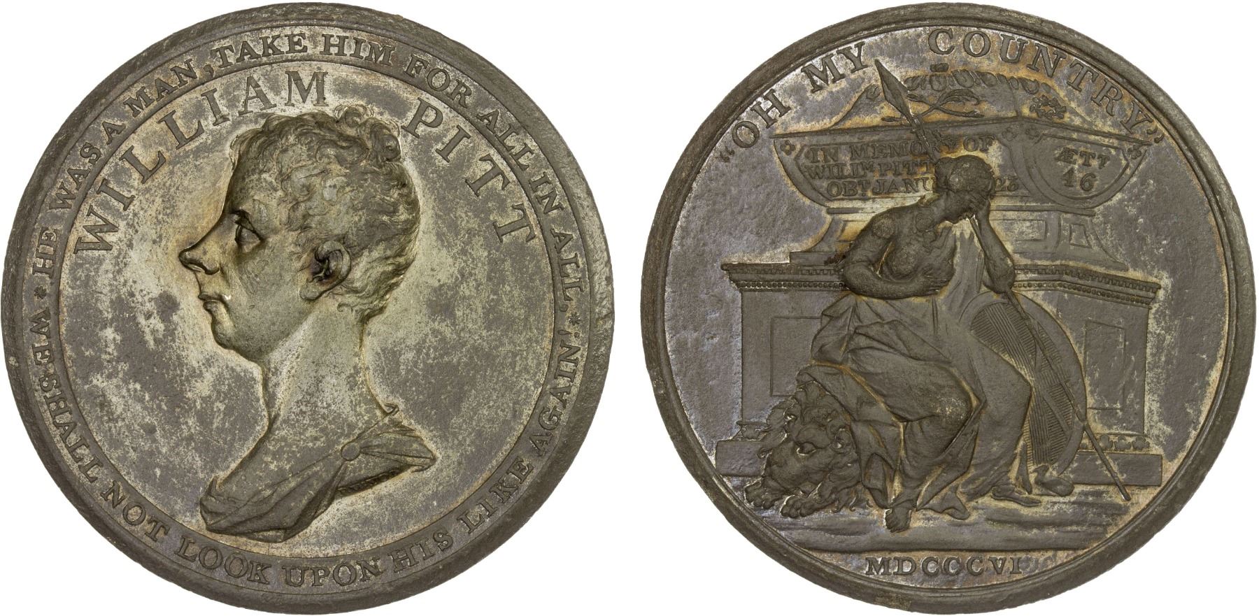 GREAT BRITAIN: medal (52.62g), 1806, BHM-617, 52mm white metal medal on the Death of William Pitt by Wyon, bust of Pitt left with WILLIAM PITT around, with band around all inscribed HE WAS A MAN, TAKE HIM FOR ALL IN ALL. - WE SHALL NOT LOOK UPON HIS LIKE AGAIN! // mourning Britannia before sarcophagus with "OH MY - COUNTRY" around and MDCCCVI in exergue, some surface roughness, some luster, rare, plain edge, XF.