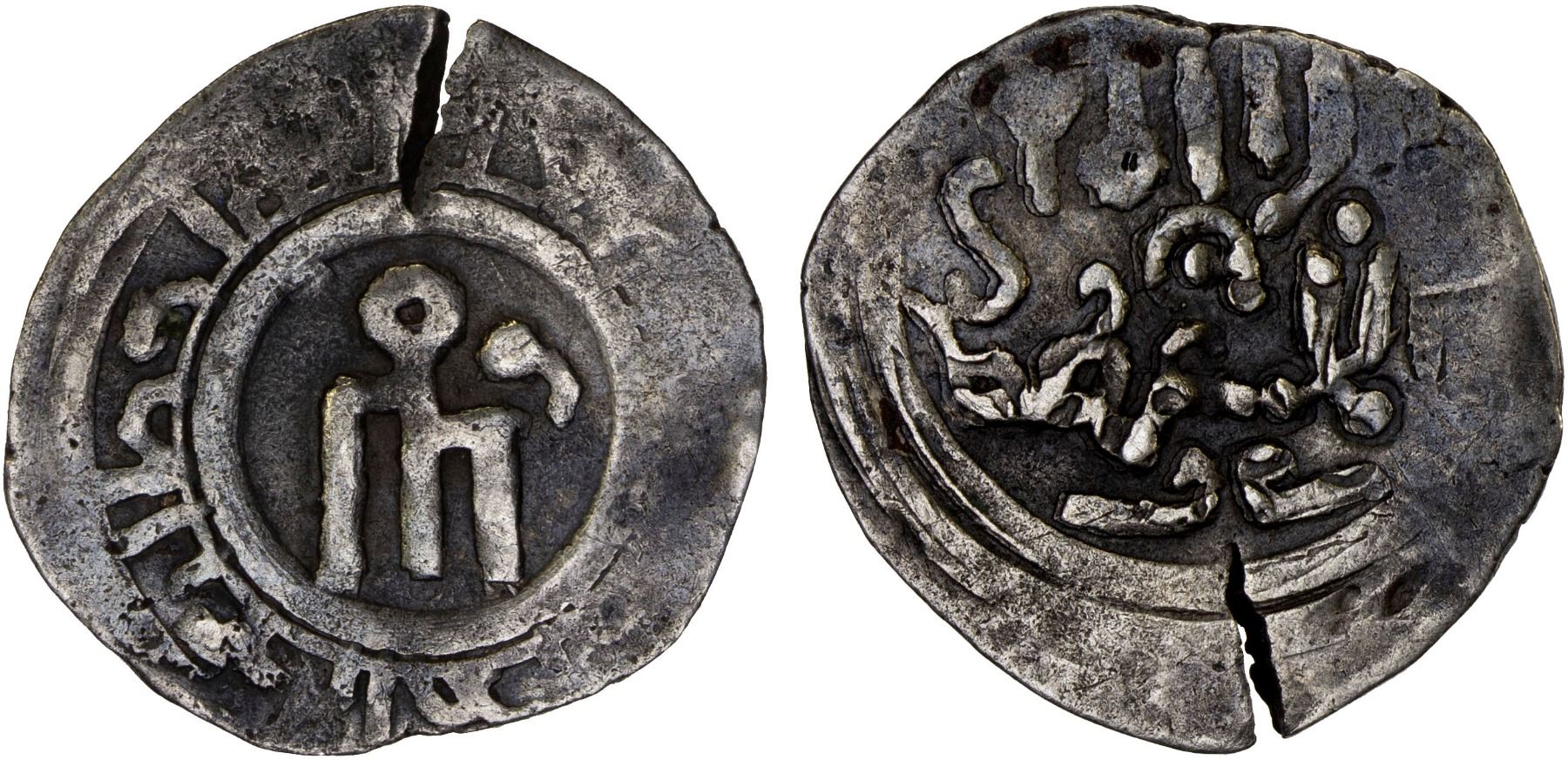 GREAT MONGOLS: Anonymous, 1240s-1250s, AR dirham (1.78g) (Imil) (in Xinjiang, China), ND, A-3797 (O1979), cf. Zeno-78616, trident tamgha with uneven shoulders, circle above, "comma" to right, stylized legend around (sometimes showing the mint Imil) // Arabic al-imam / al-a'zam; planchet crack (from stamping); nice strike for this type, VF, RRR.