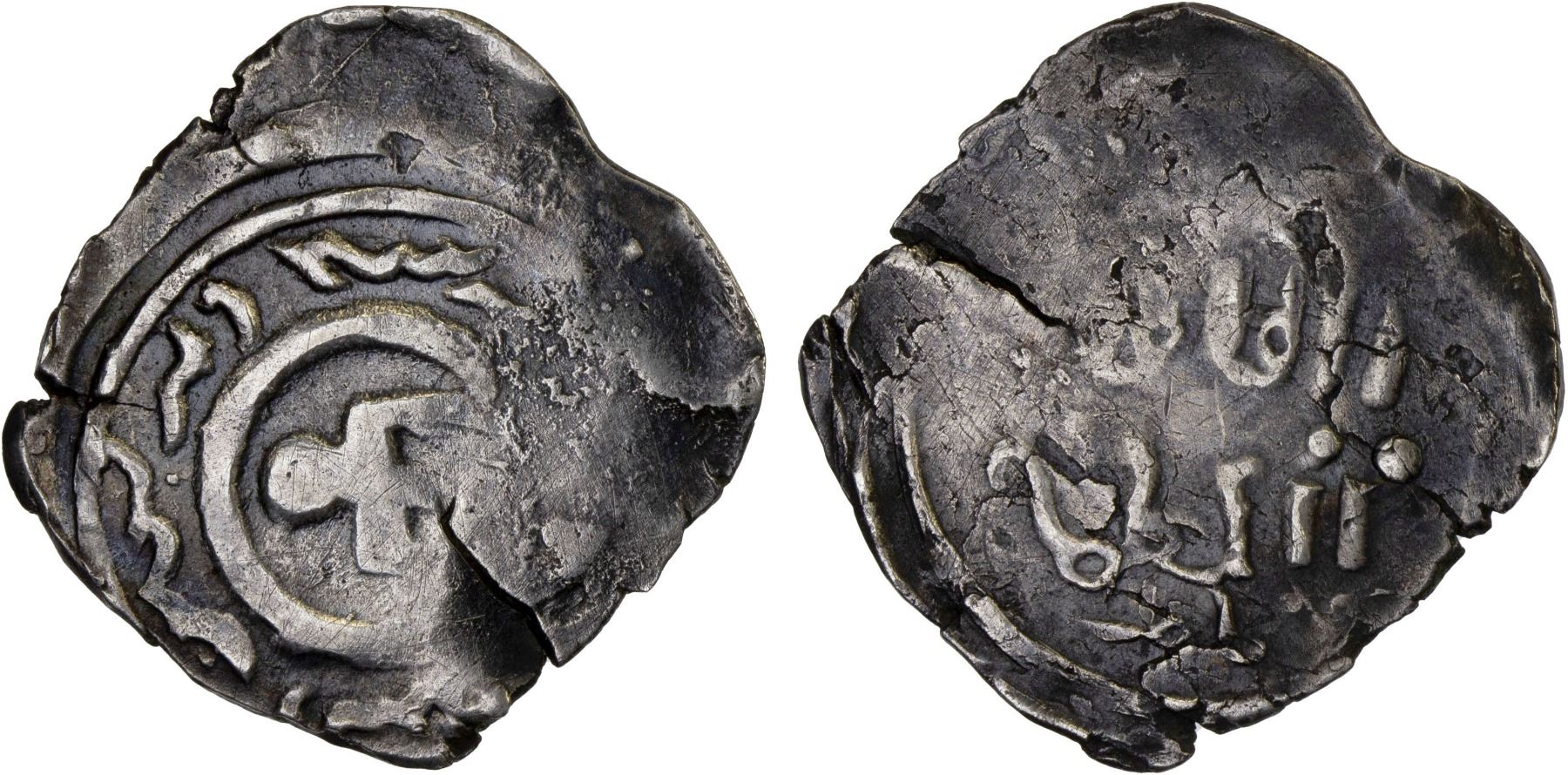 GREAT MONGOLS: Anonymous, 1240s-1250s, AR dirham (1.78g) (Imil) (in Xinjiang, China), ND, A-3798 (P1979), cf. Zeno-78616, trident tamgha with even shoulders, circle above, totally stylized legend around // blundered Arabic al-imam / al-a'zam, with what is probably intended for the mint name Imil below; planchet crack (from stamping); about 30% flat strike, VF, RRR.