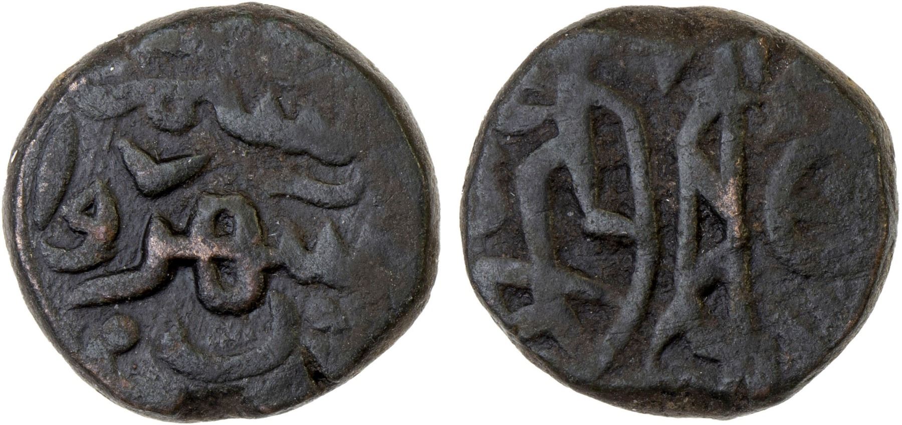 GREAT MONGOLS: Anonymous, 13th century, AE jital (3.22g), Shahrwan (= Sah Rawan), ND, A-1978, Rajput horseman right, probably no legends // Arabic legend sîm / shahriwa- / n, probably related to the town or district in Afghanistan, now called Sah Rawan, about 50 miles northeast of Qunduz near the Amu Darya river, VF, RRR. Style similar to the late Khwarizmshah jitals of Qunduz. A very inferior example was sold in our Auction 53, lot 2076.