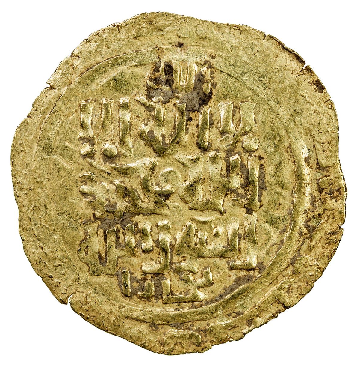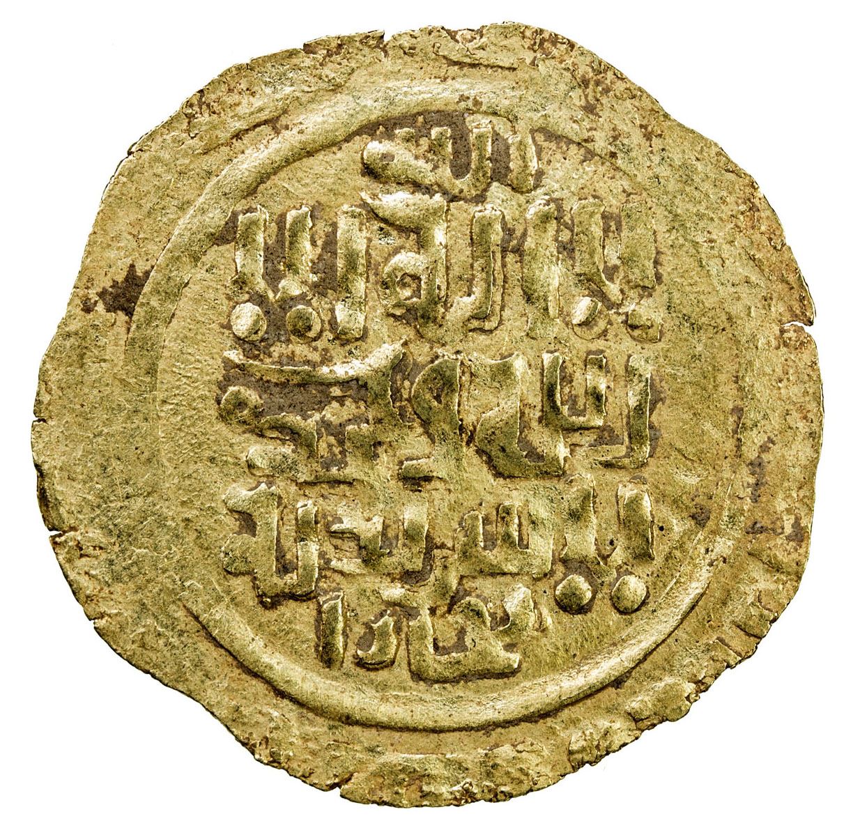 GREAT MONGOLS: Anonymous, ca. 1220s-1230s, AV dinar (2.36g), Bukhara, ND, A-B1967, totally anonymous, only the kalima on both sides, with the mint below the kalima on both sides, always undated, bold strike, EF.