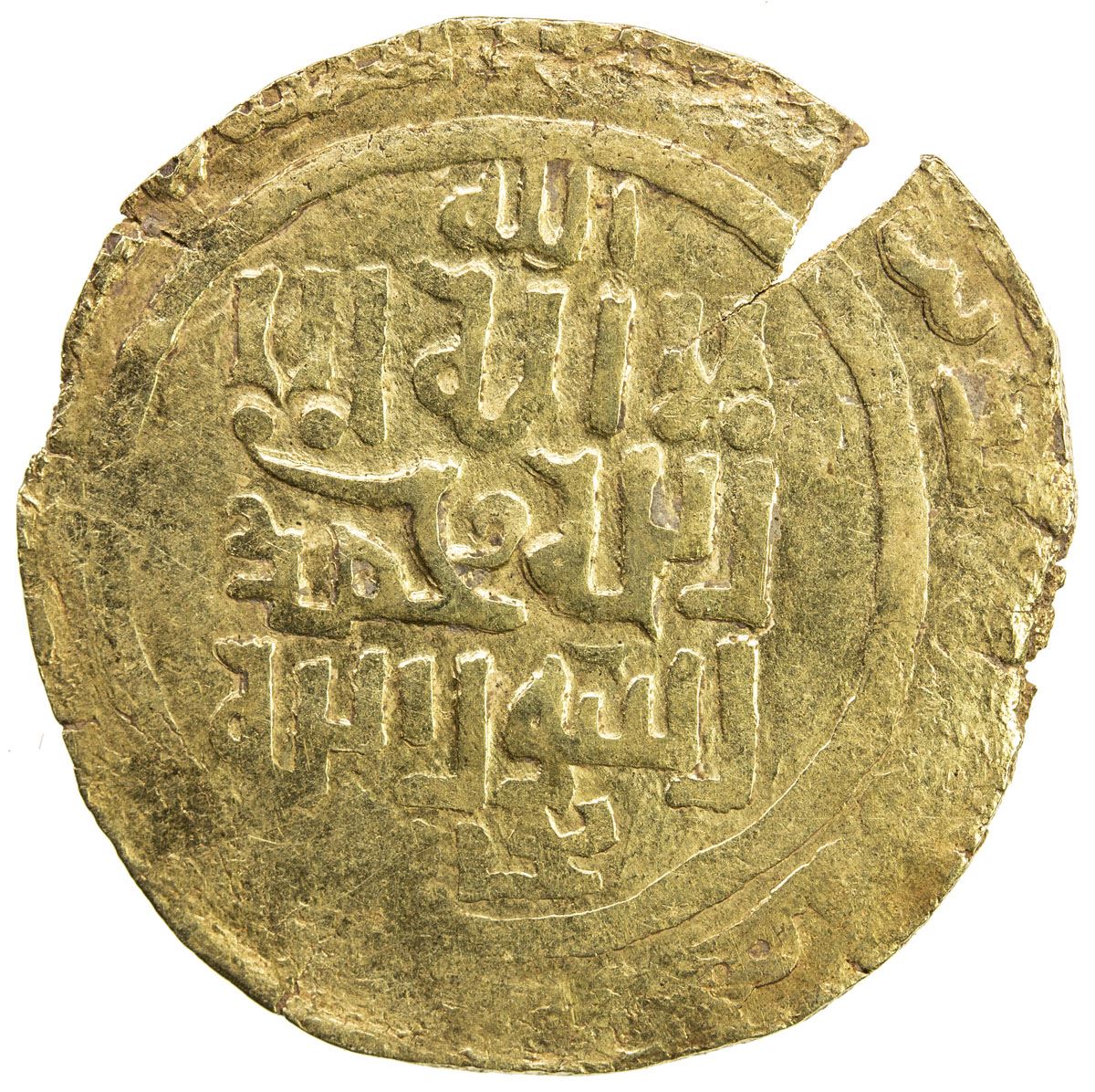 GREAT MONGOLS: Anonymous, ca. 1220s-1230s, AV dinar (6.43g), Bukhara, ND, A-B1967, totally anonymous, early style, possibly struck before the death of Chingiz Khan in 1227, typical crude strike, minimal weakness for this type, EF, R.