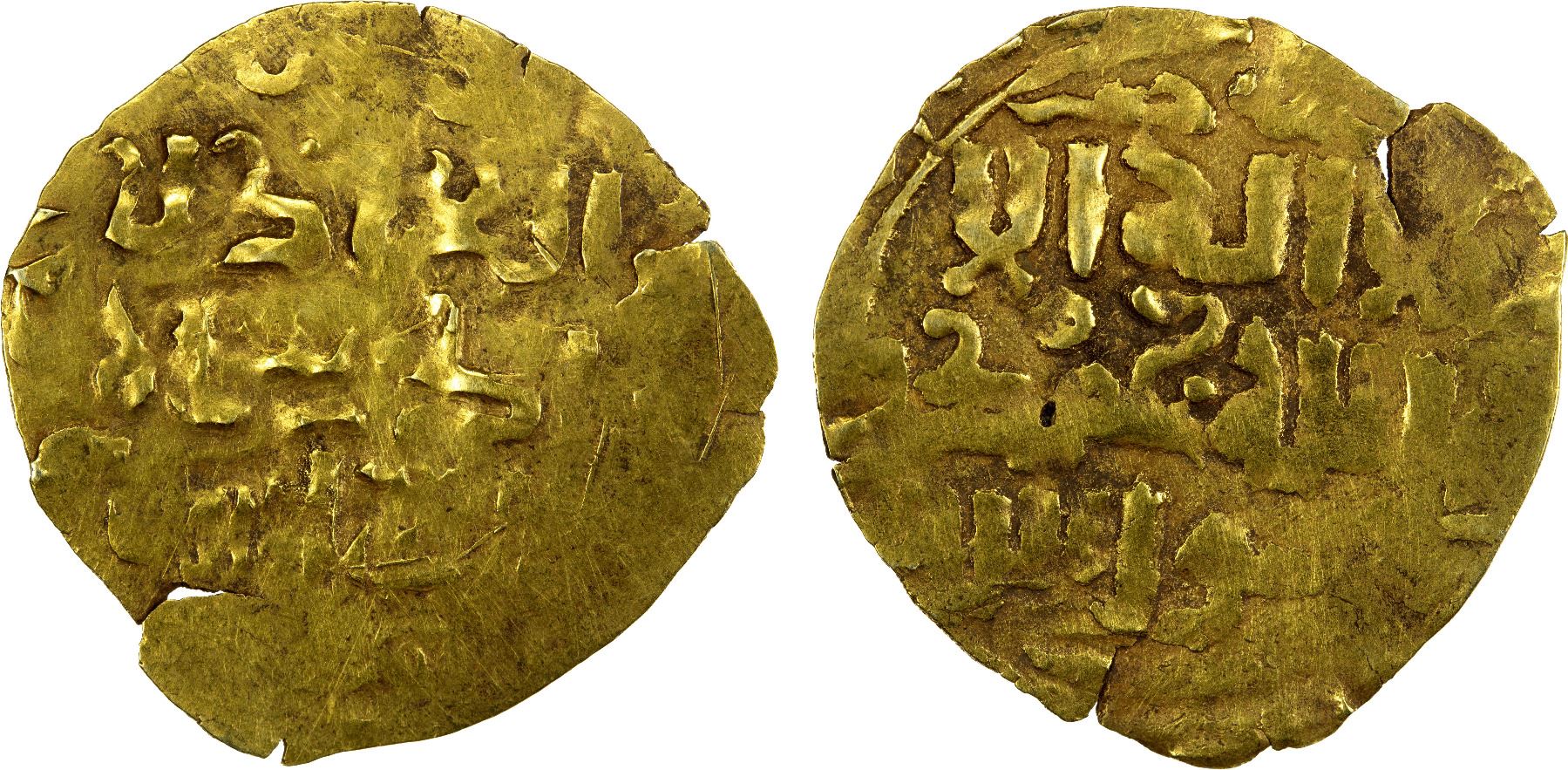 GREAT MONGOLS: Anonymous, ca. 1220s-1240s, AV dinar (2.75g), AHxx5, A-1966, obverse legend al-qa'an / al-a'zam / .... / ...., with uncertain word in the third line, and what seems to be sanat khams ("year five") above the kalima on the reverse, crude strike, VF, RRR.