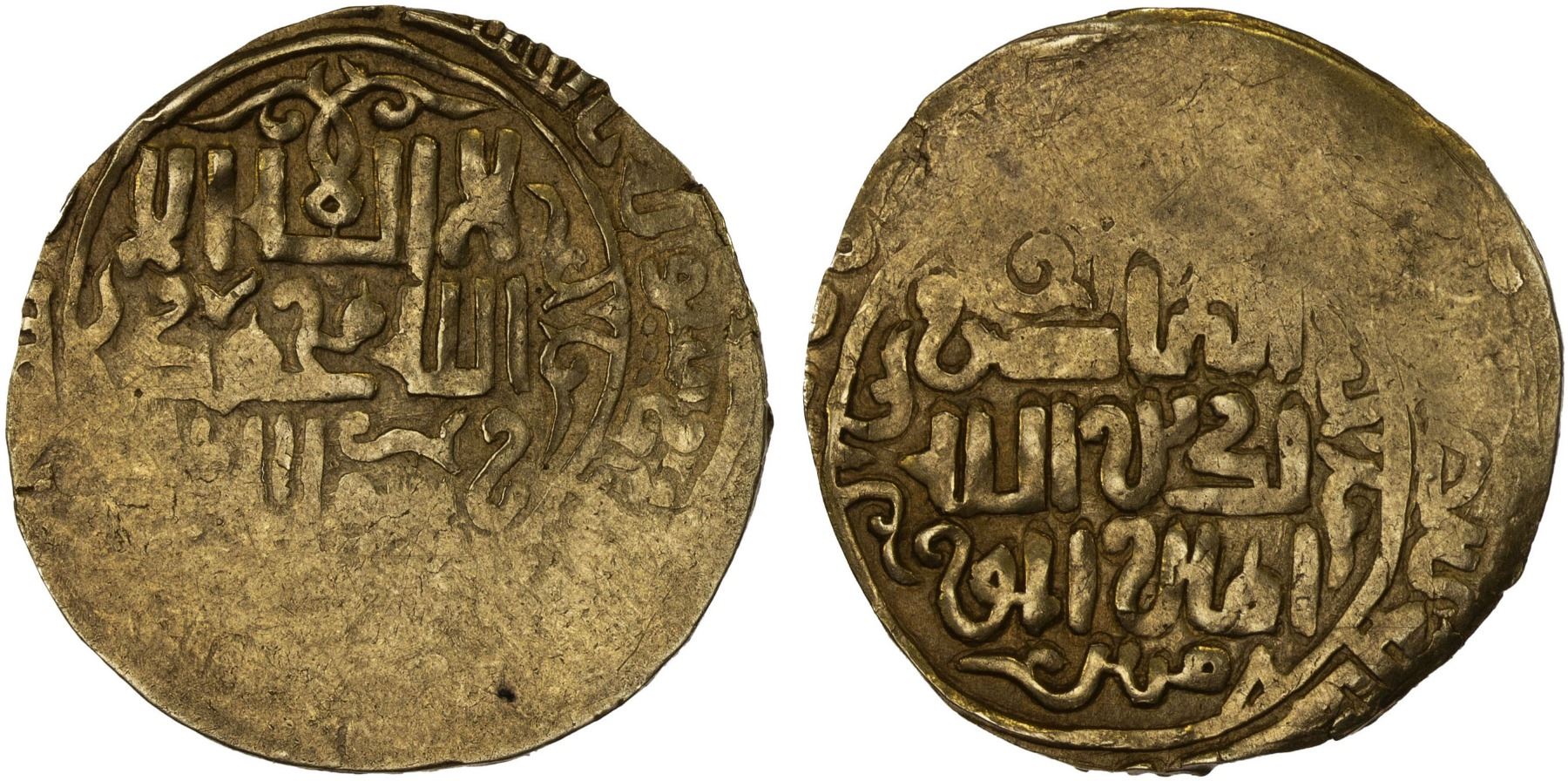 GREAT MONGOLS: Anonymous, ca. 1220s-1240s, AV dinar (5.96g), ND/DM, A-A1967, citing only the caliph al-Nasir li-din Allah, likely after his death, style of the Badakhshan region; about 30% flat strike (as usual), crude VF.