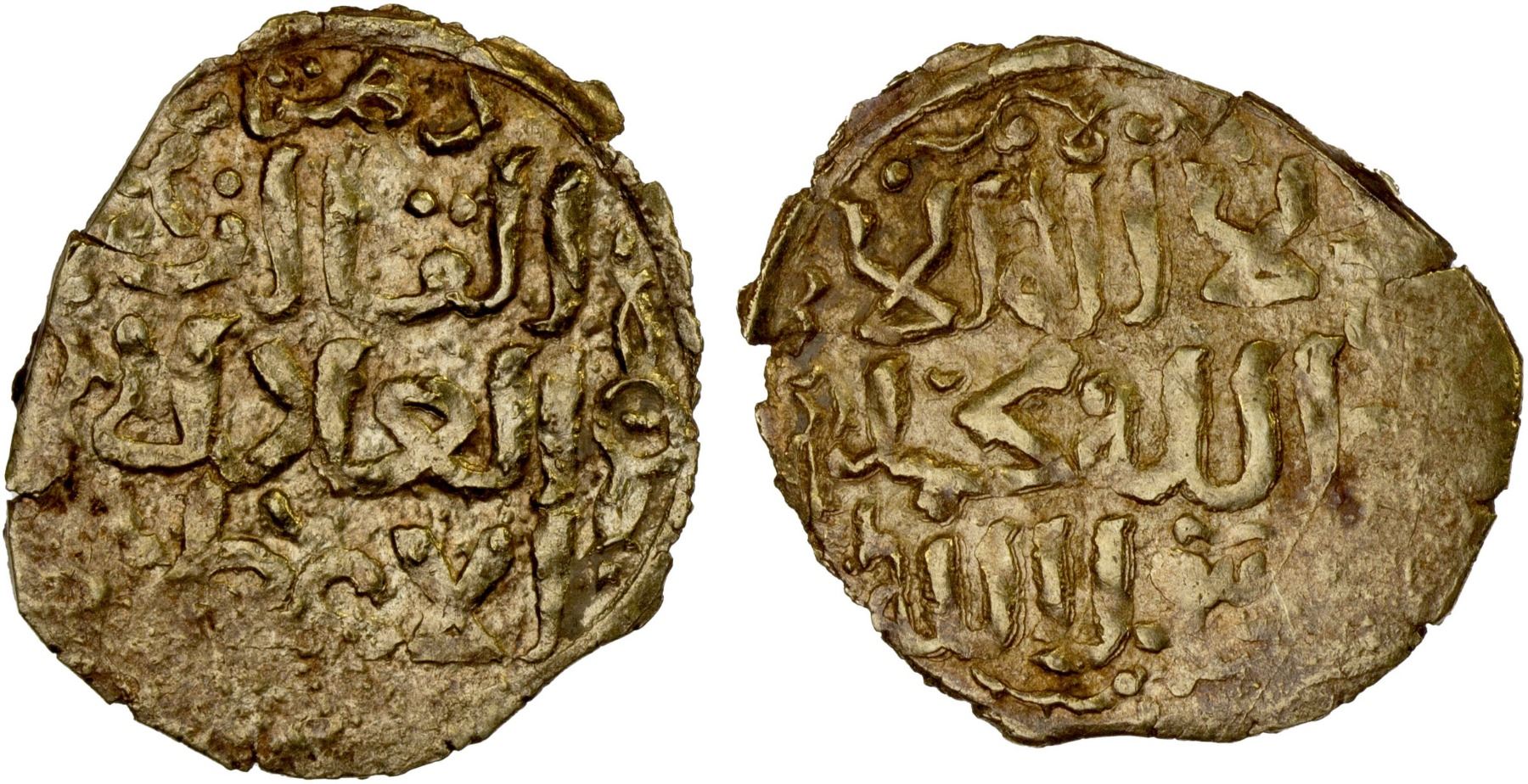 GREAT MONGOLS: Anonymous, ca. 1220s-1250s, AV dinar (1.98g), Dihistan, ND/DM, A-1966, obverse legend al-qa'an / al-'adil / al-a'zam, with the mint name above // the kalima; somewhat crude strike, VF-XF, RR.