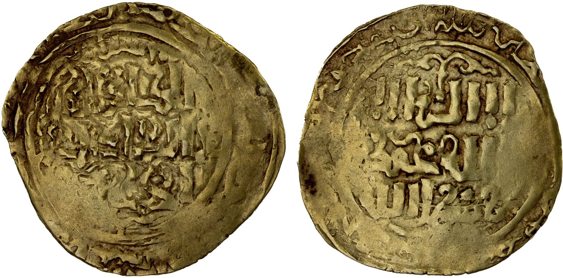 GREAT MONGOLS: Anonymous, ca. 1230s-1260s, AV dinar (4.76g), Astarabad, ND, A-Y3723 (1965), crude style, likely at least 70% gold fineness, VF.