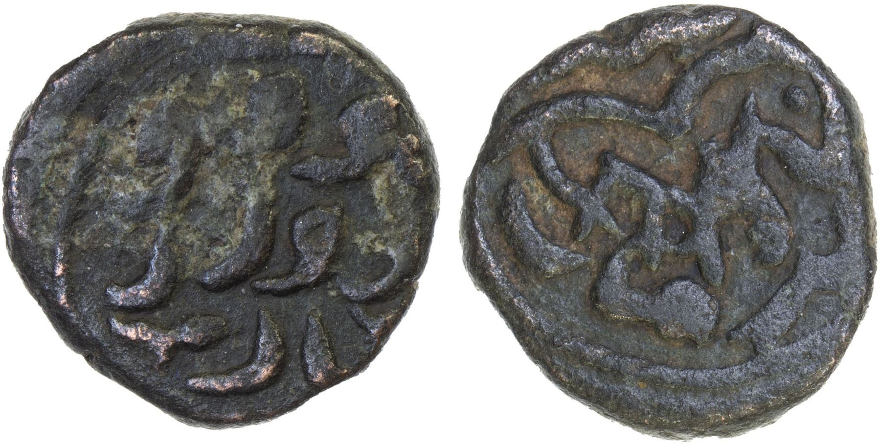 GREAT MONGOLS: Anonymous, ca. 1240s-1260s, AE jital (3.48g), Kurraman, ND, A-3779E, Zeno-333563, Persian be-tawfiq-e parvardegan // darb and mint name below a horse facing right, VF, RRR.